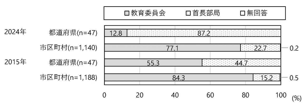 2024年調査の都道府県は「教育委員会」が12.8%、「首長部局」が87.2%、市区町村は「教育委員会」が77.1%、「首長部局」が22.7%であった。2015年調査の都道府県では「教育委員会」が55.3%と約半数を占めたが、2024年調査では9割近くが「首長部局」であり、都道府県のスポーツ担当部署は教育委員会から首長部局へ移管した。