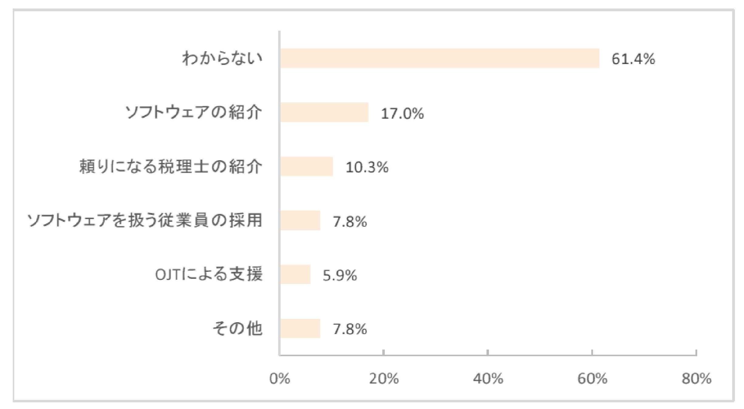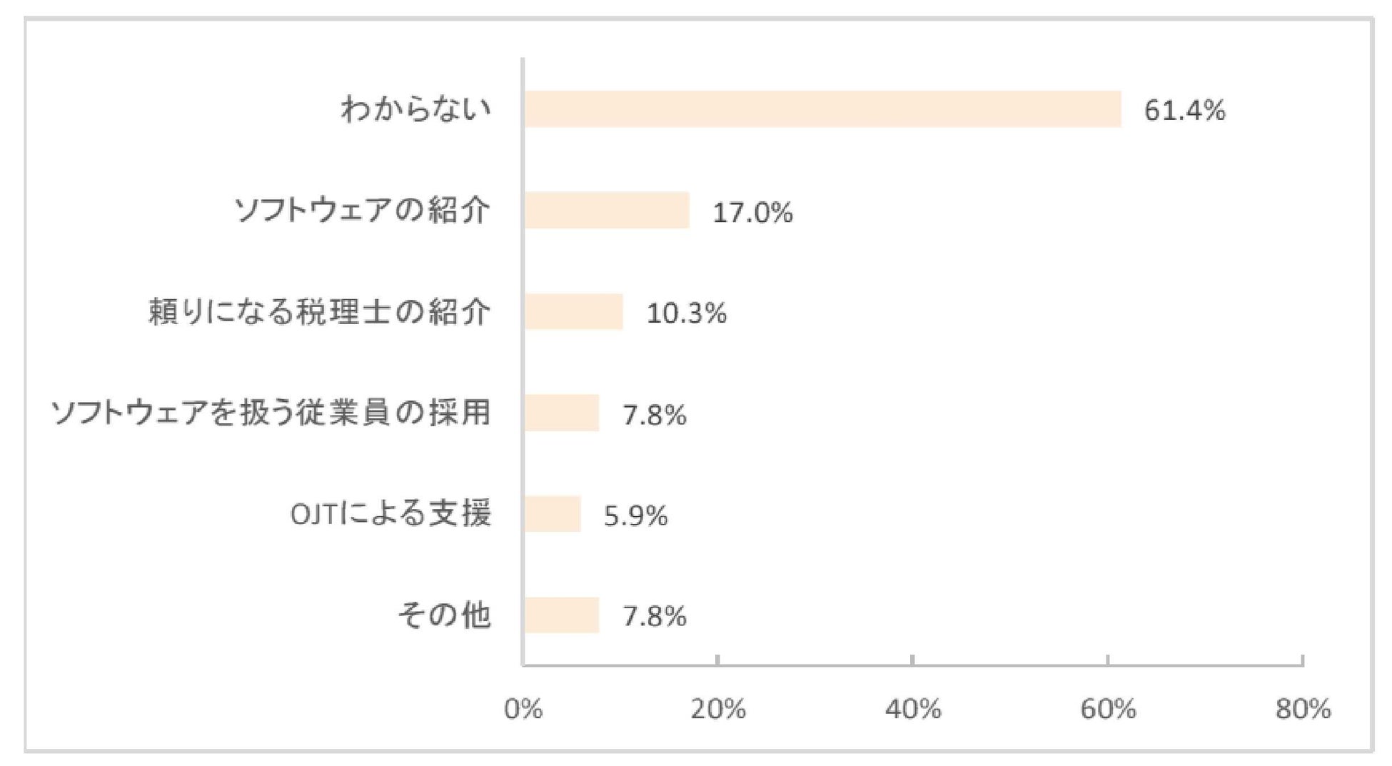 「よく知っている」9.4%、「だいたい知っている」48.0%と一定の知名度だがインボイス制度ほど理解は進んでおらず、導入に向けた支援策として「わからない」61.4%となり、紙と電子データが混在する状況で何をすればよいか分からない状態の企業もあると推測されます。