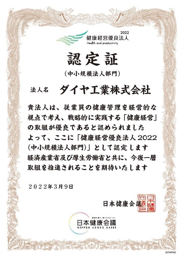 ダイヤ工業株式会社「健康経営優良法人2022(中小規模法人部門)」に2年連続認定