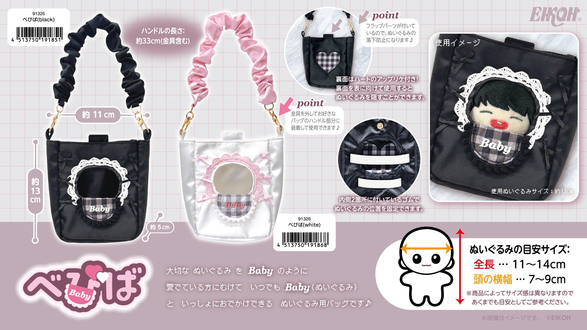 お持ちのぬいぐるみ(推奨サイズ:全長H11~14cm)をBabyのように愛でている方にむけて、いつでもBaby(ぬいぐるみ)と一緒におでかけができる、ぬいぐるみ用バッグです。正面は窓になっていて、ぬいぐるみのお顔を出すことができます。バッグのハンドル部分に装着することも可能!推し活・ぬい活がもっと楽しくなるエイコーオリジナルの新ブランドシリーズ商品です。
