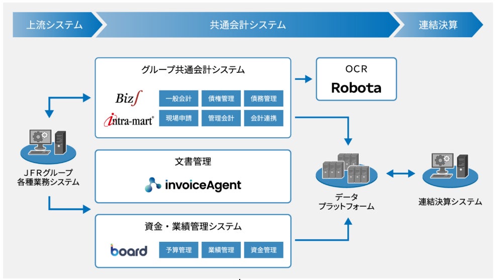 本システムは、NTTデータ・ビズインテグラルのERPパッケージソフトウエア「Biz∫」およびグループ統合「データプラットフォーム」を中核とし、NTTデータが導入を行いました。顧客のバックオフィス業務を一元的に管理する「Biz∫」の標準機能を活用することで、JFRグループの業務の標準化や見直しを行い、これまで課題になっていたシステムのブラックボックス化や非効率・属人的な業務プロセスの解決を実現しています。また、資金・業績・予算など経営管理情報の見える化・分析を目的として、Board JapanのEPM・BIソリューション「Board」を導入し、直感的かつ迅速な経営分析を実現しています。さらに、請求書の取り込み作業を効率化するためファーストアカウンティングのAI-OCR「Robota」、電子帳簿保存法に対応するためウイングアーク1stの文書管理システム「invoiceAgent」を組み込むことで現場業務の効率化・デジタル化を図っています。これにより、財務・管理双方の要件を満たしながら経営管理の質向上に寄与します。システム基盤には将来の拡張性にも優れた「intra-mart®」基盤を採用することで、事業拡大や環境の変化に柔軟に対応できるシステムを構築しています。(図1)