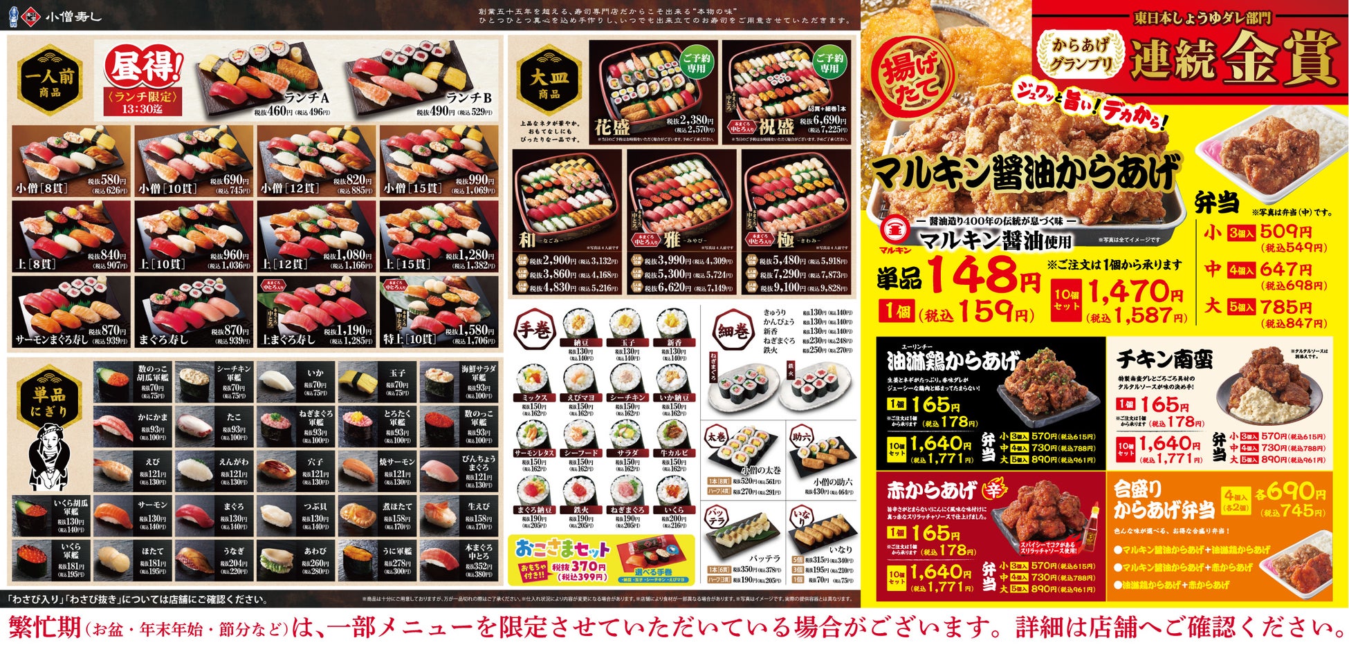 小僧寿しは、創業50年以上の伝統を受け継いでおりますテイクアウト専門寿司店です。小僧寿しでは、一部の店舗を除き、「旬の素材」「季節を投影した商品」を、およそ1週間ごとに、フェア商品をお届けしております。また、からあげグランプリ3年連続金賞受賞の「からあげの中津家」というブランドも運営しております。この機会に是非、小僧寿しをご利用いただけましたら幸いでございます。