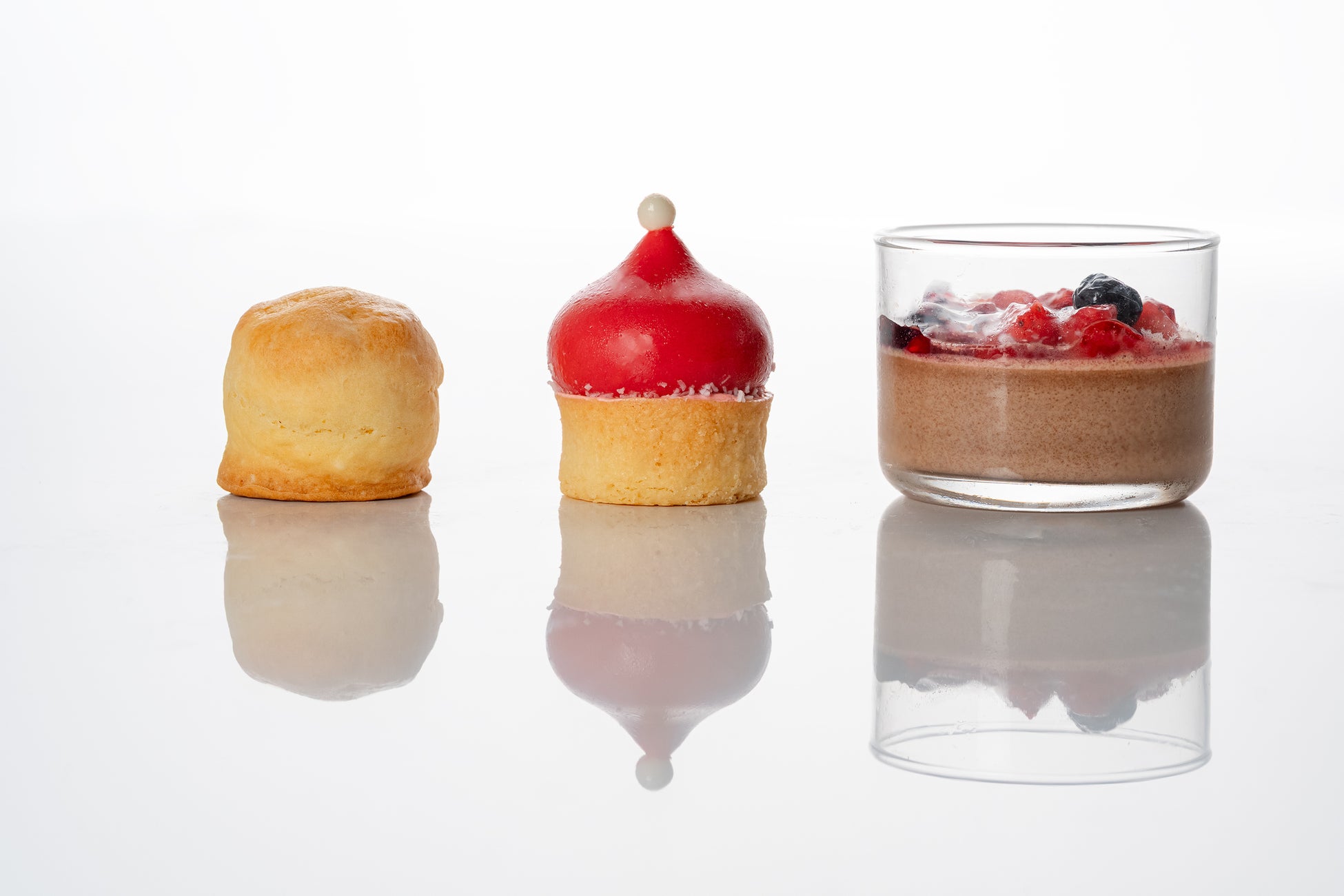 中段には、ホリデーシーズンの雪景色をイメージした3種のスイーツが登場。「マドレーヌサンド」は、バニラの芳香を放つマドレーヌをホワイトチョコレートでコーティング後、レモンバタークリームを挟んだバニラの甘味の中に柑橘のフレッシュな風味が漂う一品です。クリスマスツリーを象った抹茶フレーバーのフィナンシェにラズベリーのゼリーを塗り、仕上げにオーナメントを模したゴールドのチョコレートを飾った「抹茶のクリスマスツリー」、アーモンドのザクザクとした食感が楽しめるアーモンドチョコレートでチョコレートムースをコーティングし、コンポートしたクランベリーを乗せた「チョコとクランベリーのムース」をお召し上がりください。