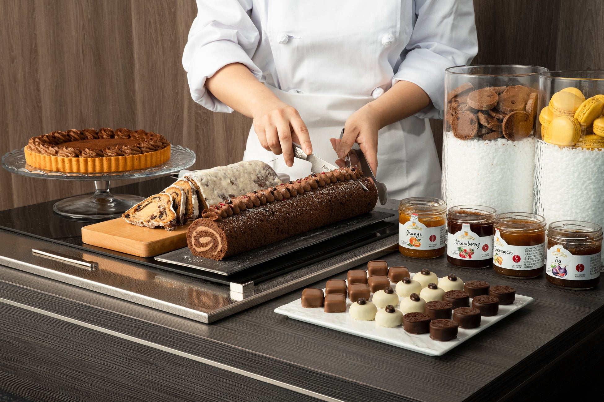 第一部・第二部(11:30~/13:30~)では、ジューシーな旨味が口いっぱいに広がる「チキンもも肉のコンフィ」または「タラの西京味噌漬け焼き」からお好きなメインディッシュをお選びいただけます。第三部(15:30~)で提供するスイーツのワゴンサービスには、クリスマスシーズンを代表するスイーツ、「シュトーレン」、「ブッシュ・ド・ノエル」や「チョコレートパイ」、パッションフルーツとレモンが爽やかに香る「マカロン」、「クッキー」、「ボンボンショコラ(3種)」の計8種のスイーツが並び、お好きなスイーツをお好きなだけご堪能いただけます。
