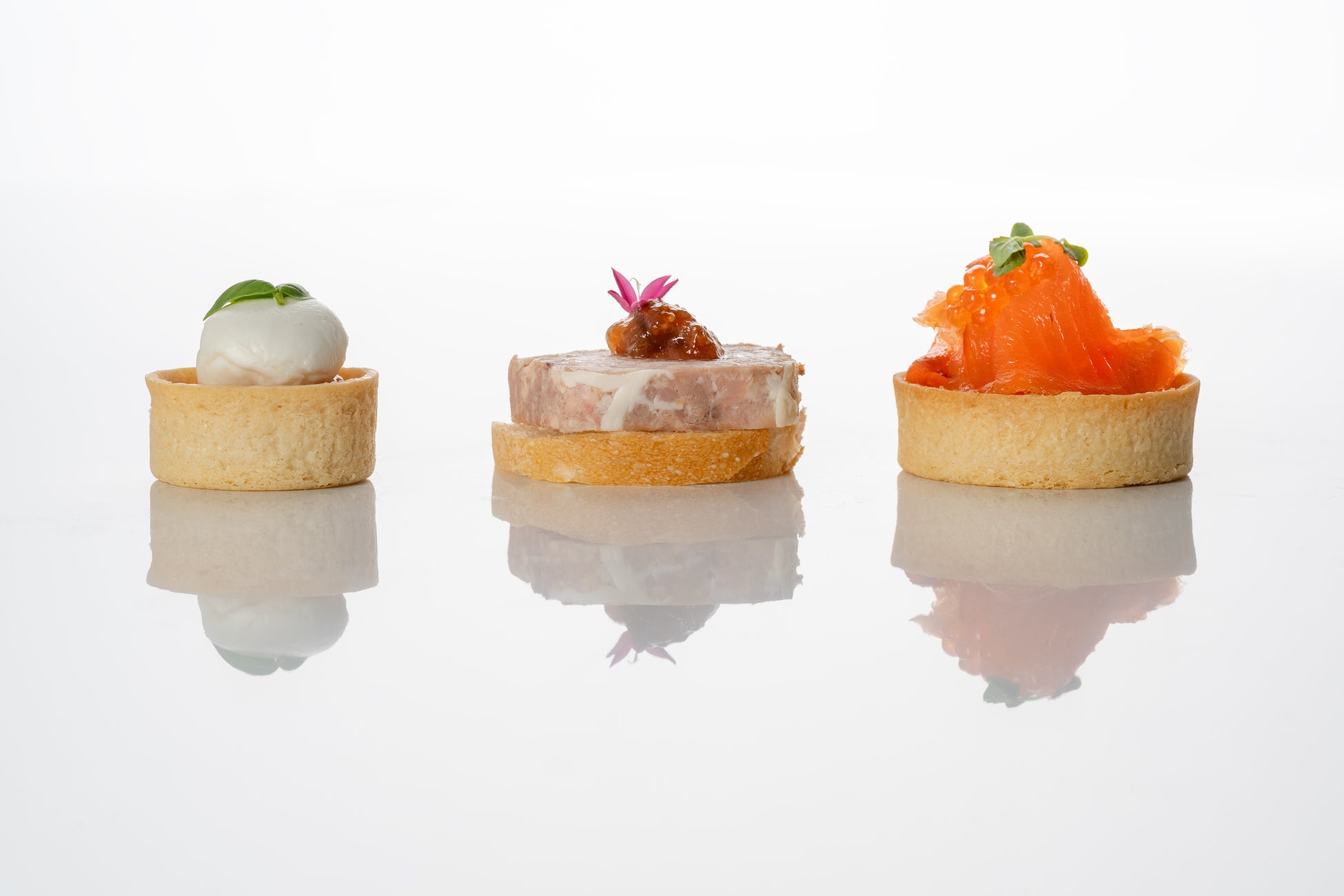 下段には、アップルシナモンジャムのほのかな香りがホリデーシーズンの訪れを感じさせる「パテドカンパーニュ」、ローストしたトマトとモッツァレラチーズのタルトレット「モッツァレラタルトレット」、「サーモンスピナッチキッシュ」の3種の華やかなセイボリーをご用意いたしました。