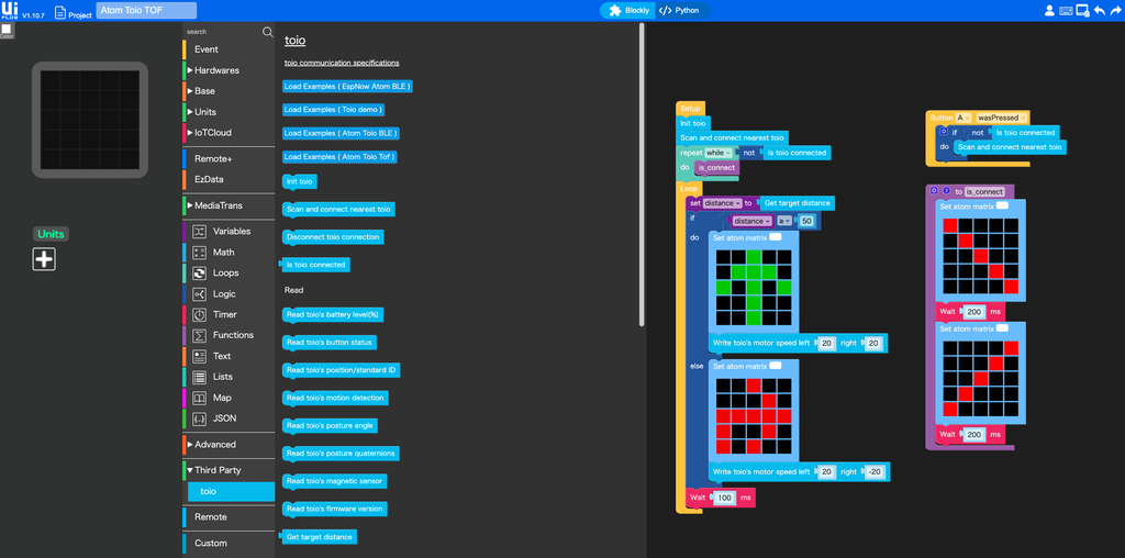 M5Stack社のビジュアルプログラミング言語「UiFlow」に用意されたtoio™ 連携用ブロックを使用して簡単に連携開発をすることができます。本体にはTime-of-Flight(ToF)方式による距離検出センサVL53L0Xを搭載しており、これを利用したサンプルプログラムをすぐに試すことができます。