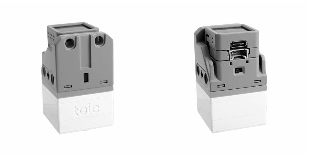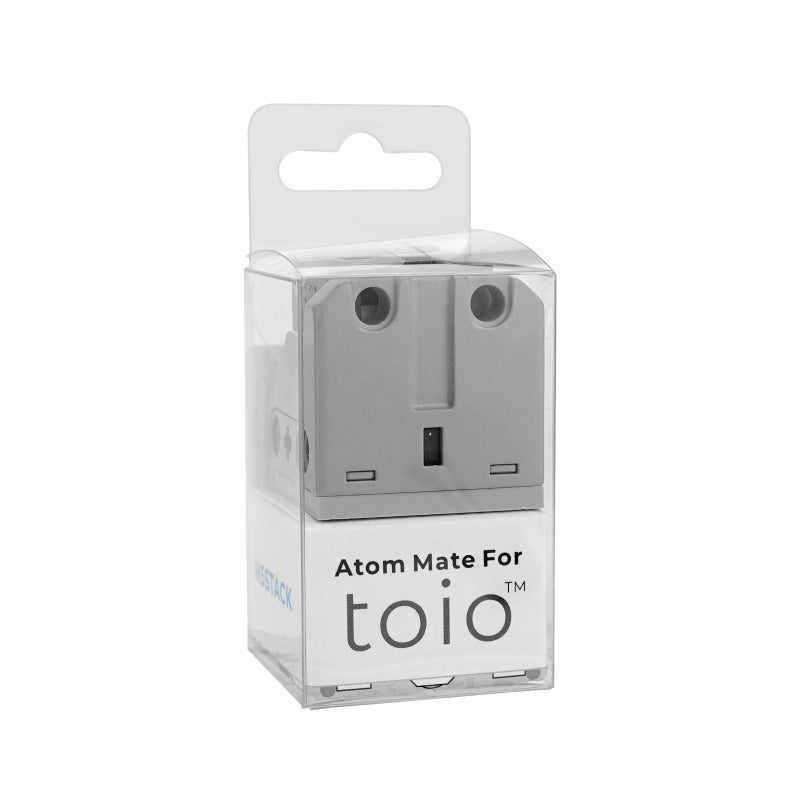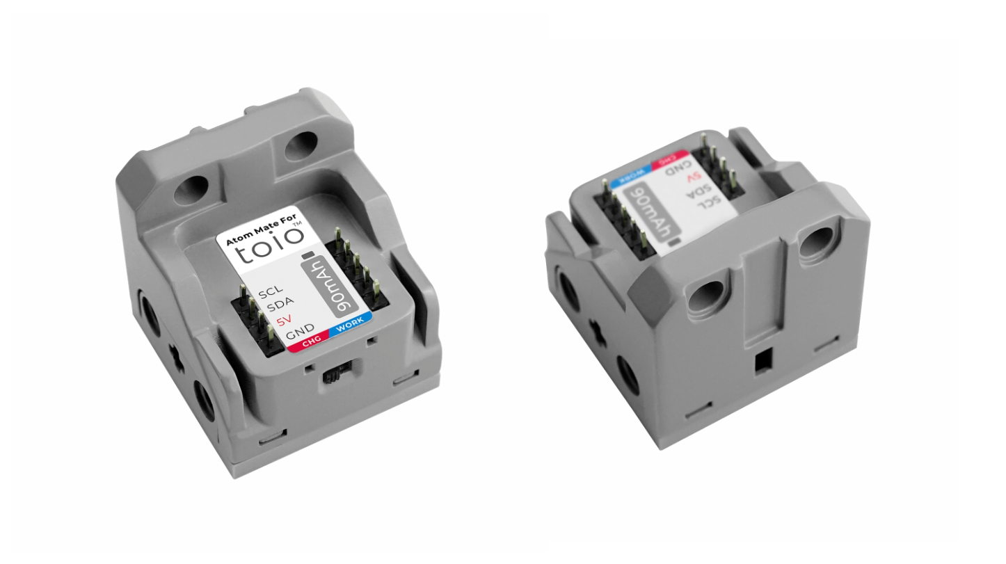 「ATOM Mate for toio™」は、株式会社ソニー・インタラクティブエンタテインメントの「toio™ コア キューブ」とM5Stack社の「ATOM Matrix」または「ATOM Lite」を連携して使うためのM5ATOM用拡張ベースです。M5Stack社のビジュアルプログラミング環境「UiFlow」に用意されたtoio™ 連携用ブロックを使用して簡単に「toio™ コア キューブ」と接続し、連携プログラミングをすることができます。