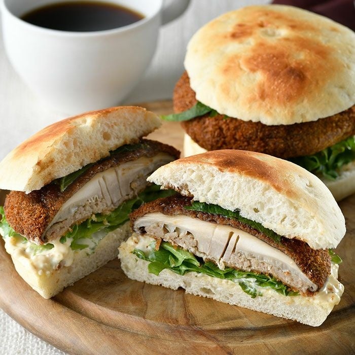 自家製フォカッチャに合わせるのは、紀伊山地・龍神村で育てた直径12㎝の巨大椎茸。紀州南高梅を練り込んだ合挽き肉を詰めてフライにしており、じゅわりとジューシー!別添えの梅ソースをかければ程よい酸味が椎茸の香りを一層引き立て、唸る旨さに。大葉やレタスを挟むのもおすすめです!