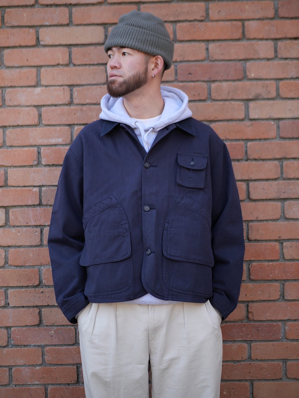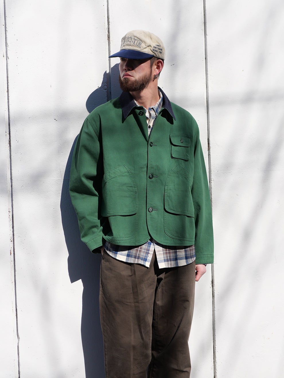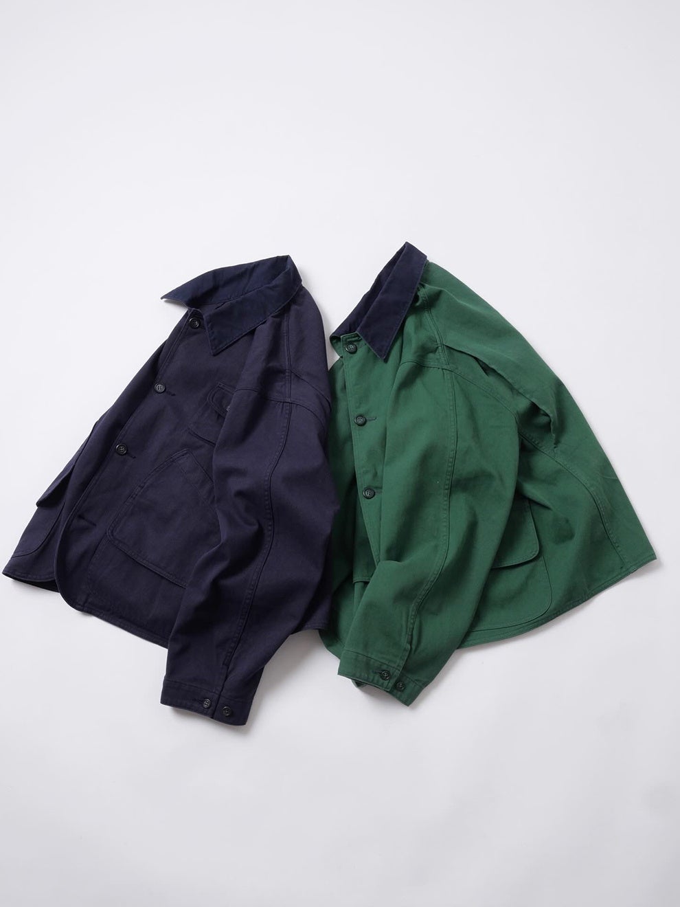 カラーはNAVYとGREENの2色展開。ハンティングジャケットに多く見られるベージュやブラウンではなく、現代的なスタイリングに取り入れやすい配色にしました。NAVYは暗所では黒にも見えるほど濃いトーンが特徴で、汎用性の高い色味です。GREENは落ち着いた色調で、ブラックのシューズやキャップとも自然に調和します。