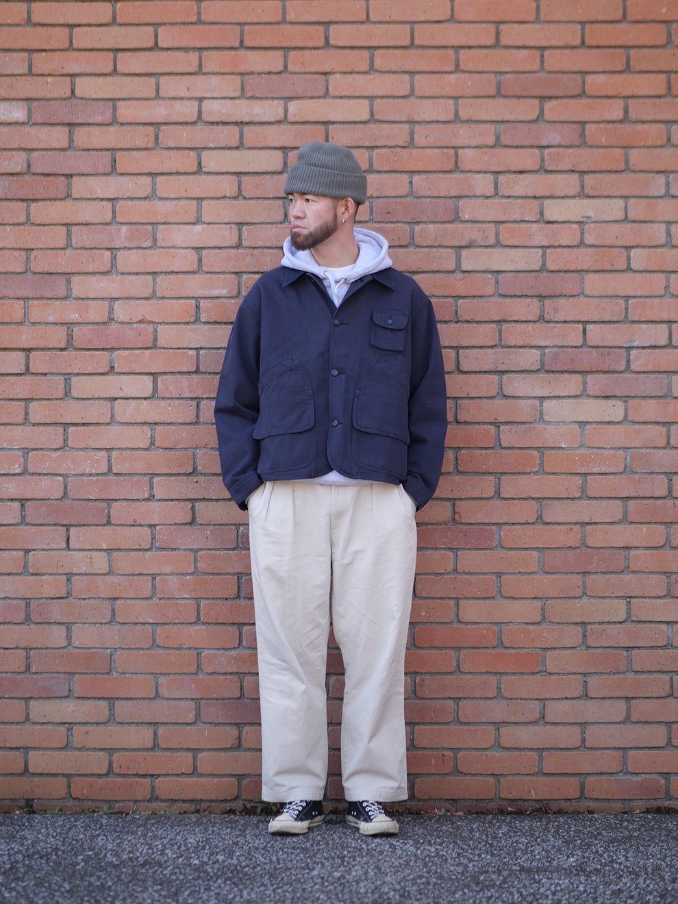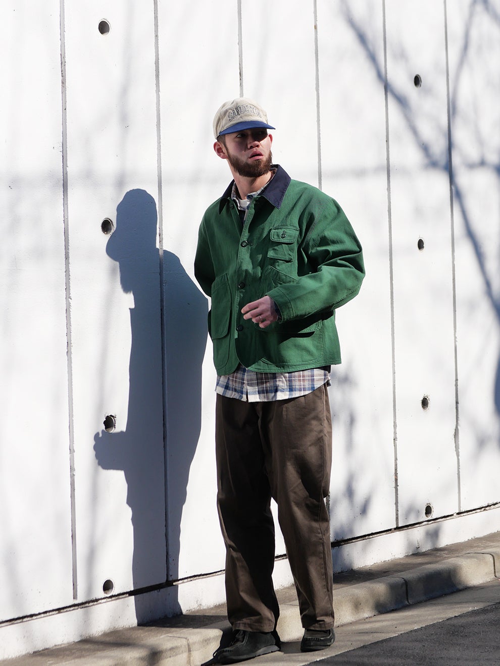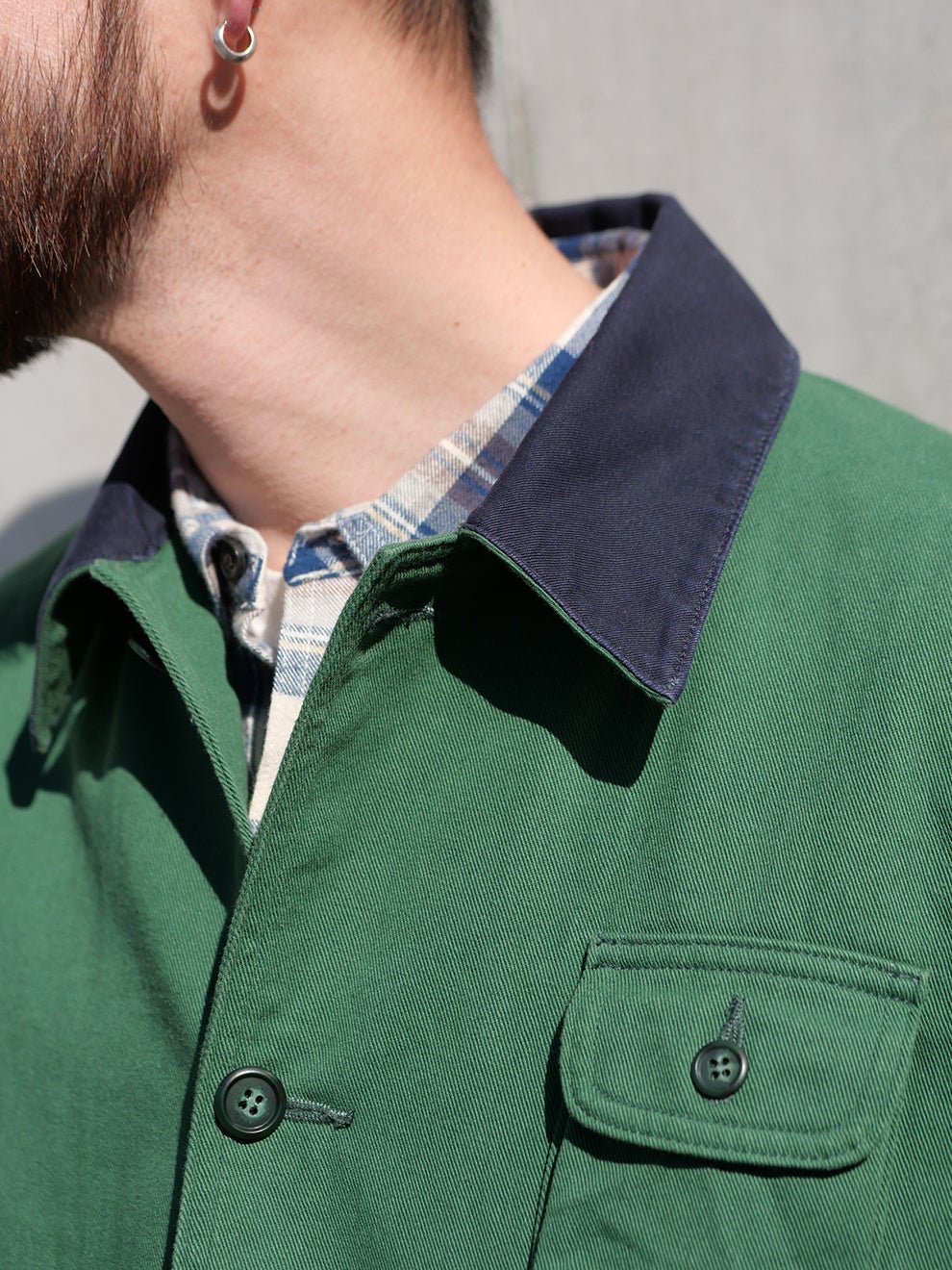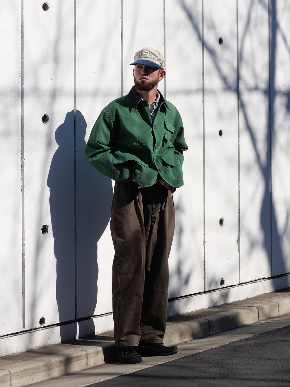 カラーはNAVYとGREENの2色展開。ハンティングジャケットに多く見られるベージュやブラウンではなく、現代的なスタイリングに取り入れやすい配色にしました。NAVYは暗所では黒にも見えるほど濃いトーンが特徴で、汎用性の高い色味です。GREENは落ち着いた色調で、ブラックのシューズやキャップとも自然に調和します。