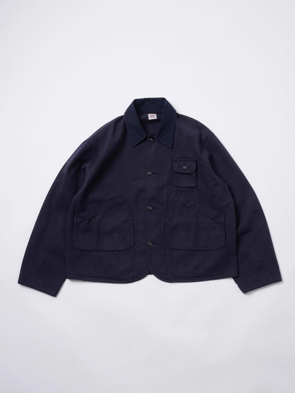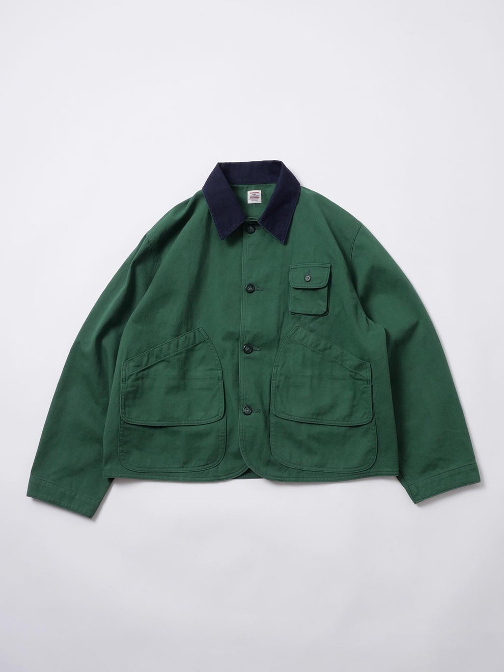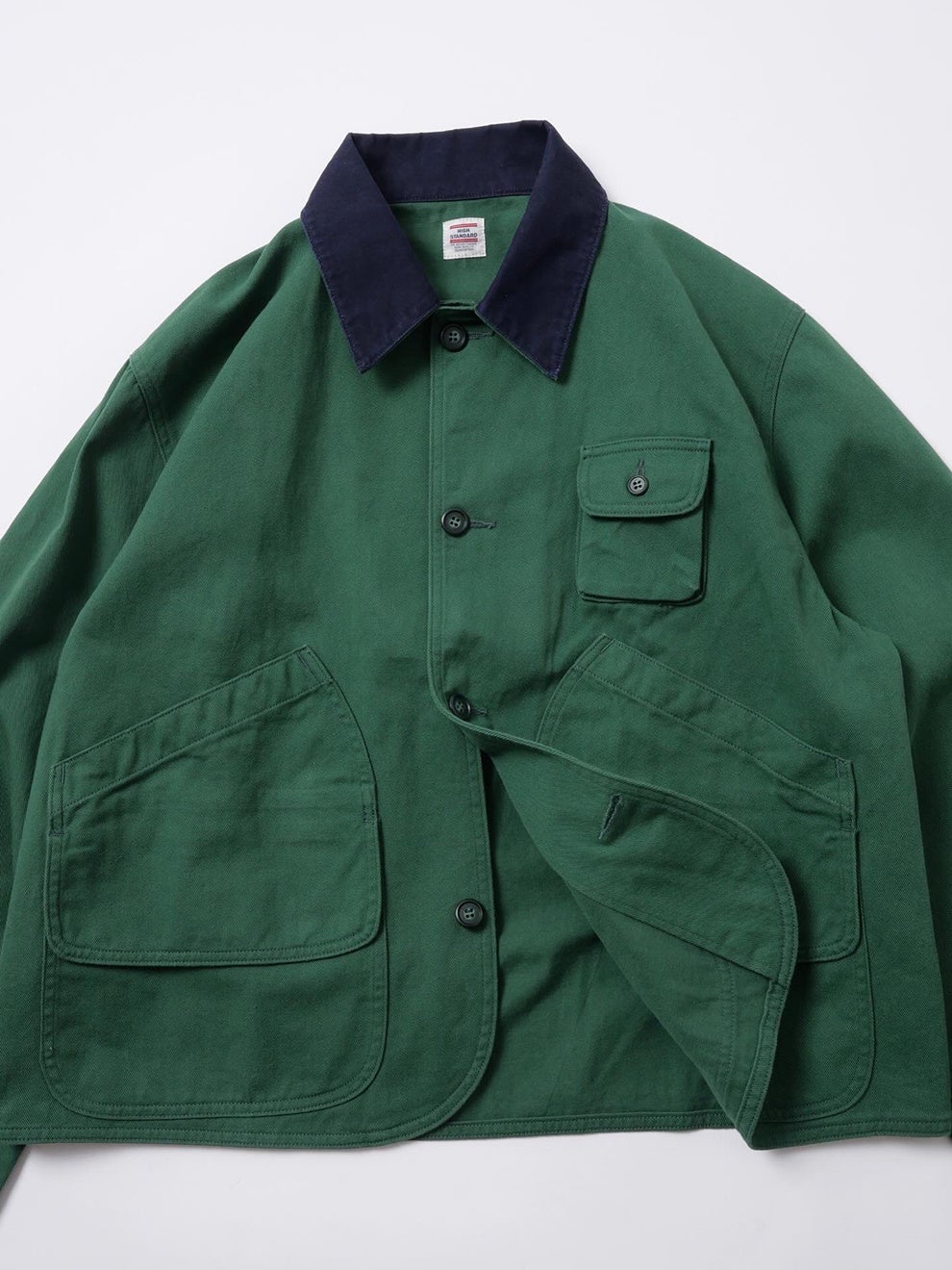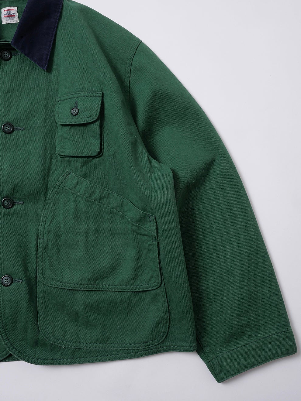 襟元には細畝のコーデュロイを配し、素材の切り替えによって過度な土臭さを抑えながら都会的な印象を加えました。背面には〈HIGH! STANDARD〉のオリジナルタグを配置しています。