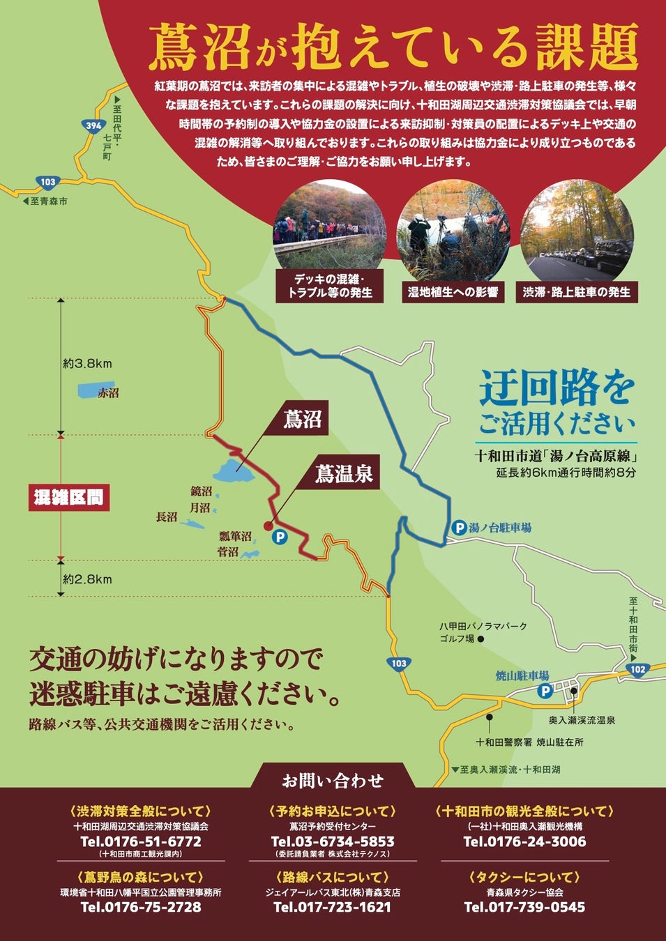 これらの課題の解決に向け、一般社団法人十和田奥入瀬観光機構(TOWADA TRAVEL)が構成員となっている十和田湖周辺交通渋滞対策協議会では、早朝時間帯の事前予約制の導入や協力金の設置による来訪抑制、及び対策員の配置による、蔦沼展望デッキおよび交通の混雑の解消等へ取り組んでおります。