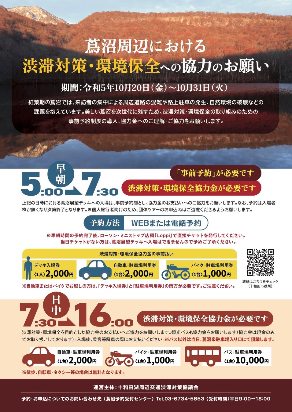 上記の日時における蔦沼展望デッキへの入場は、事前予約制とし、協力金のお支払いへのご協力をお願いします。