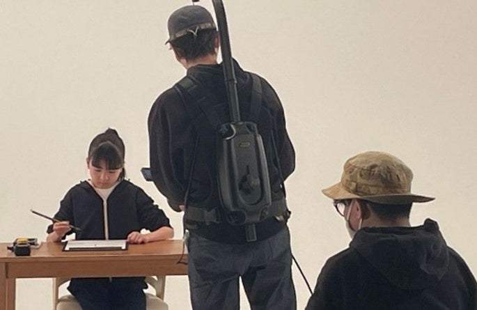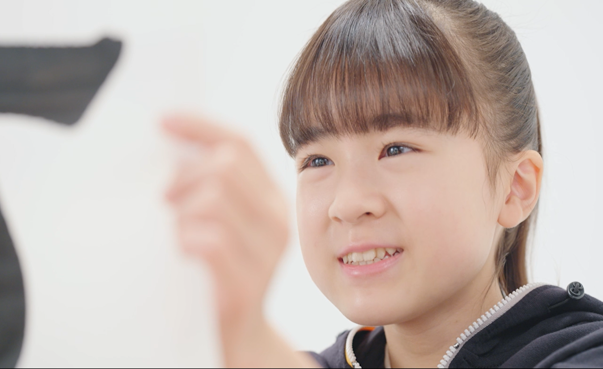 2022年2月末に都内で行われた撮影現場には、新津さんの書道の先生も立ち会いました。筆を手にした瞬間、11才の無邪気な笑顔から真剣な表情に変わりました。新津さんが書道をする姿をスタッフ一同、固唾をのんで見守っていました。集中して同じ文字を書き続け、先生にアドバイスを求める場面も。最後には納得がいく作品ができ、再び笑顔が戻りました。