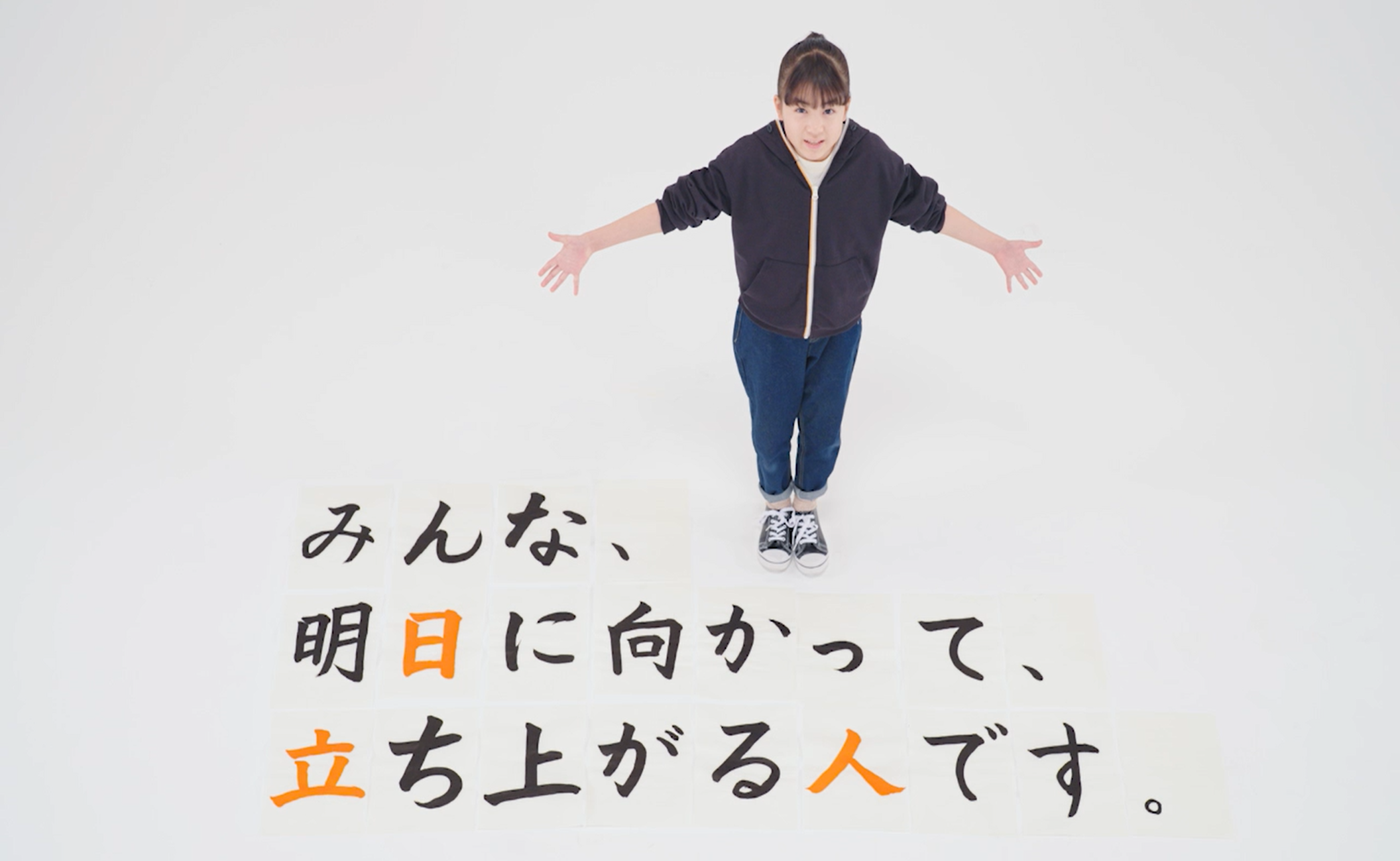 新津さんが真っ白な空間に現れ、机の前に着席するシーンから映像が始まります。新津さんの顔や体のポーズが連載「日立の人」に登場する社員の映像に重なっていきます。筆を執り、ひらがなや漢字を真剣な眼差しで書き始めます。映像中盤では、日立の社員の取り組みが紹介されます。書き終わると、キャッチコピー「みんな、明日に向かって、立ち上がる人です。」の文が完成します。