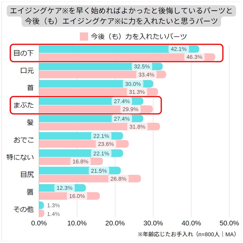 当社が行なった調査では、人の印象を判断する際に最も意識する顔のパーツは、「目」が1位にランクインし89.4%。しかしながら、目もとケアアイテムを使用している人は全体の約1割ほどと少ないことがわかっており、それを象徴するように、女性がエイジングケア*2をもっと早く始めればよかったと後悔しているパーツ、および今後(も)力を入れたいパーツの1位は「目の下」、 「まぶた」も上位にランクインしました。目もとは顔の印象を左右するだけに、ユーザーが特に注力してケアしたいパーツということがわかっております。