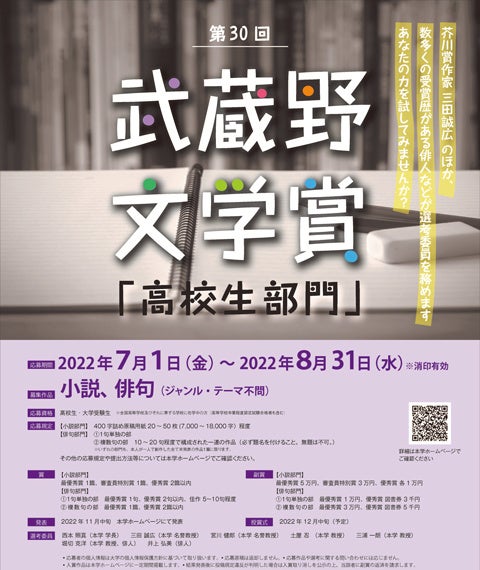 【武蔵野大学】「第30回 武蔵野文学賞(高校生部門)」の小説・俳句作品を7月1日から募集