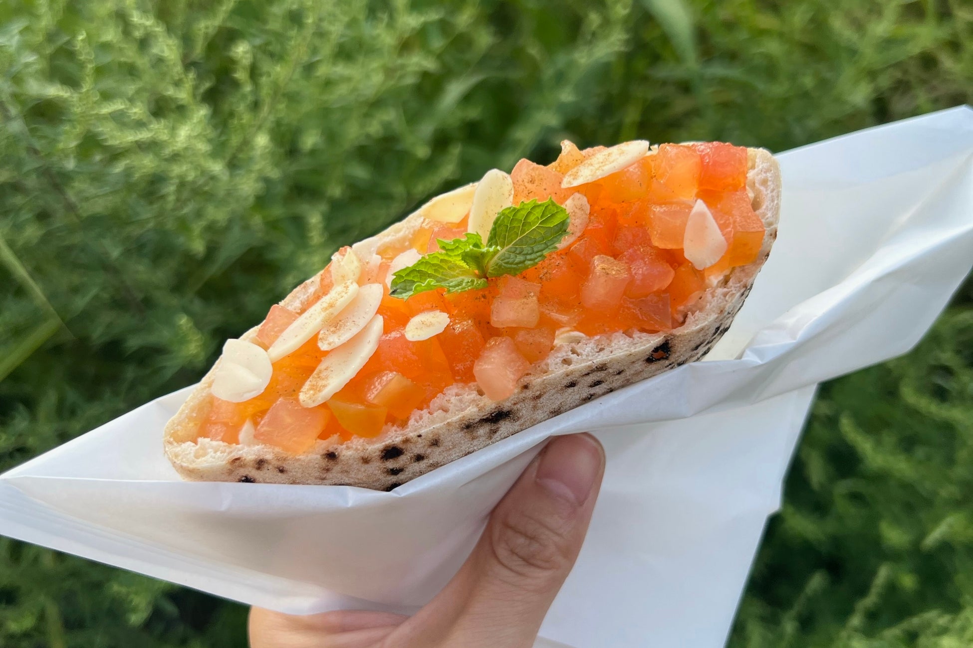 内容:長野県産りんごを使用した自家製のりんごジャムをマスカルポーネクリームとサンドしたスイーツピタ。シャキシャキりんごとトッピングのアーモンドスライスの食感が楽しいおやつ時間にぴったりの贅沢ピタです。