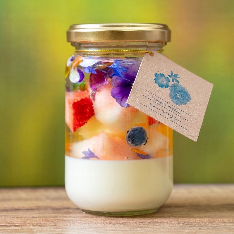山形プリンでは、そんな若いアイデアを活かし、山形市のみはらし水耕農園とも協力しながらエディブルフラワーと県産フルーツを使用した「フルーツフラワープリン」の商品開発を行った。同商品を通して、エディブルフラワーの研究と認知を広めるとともに県産フルーツの魅力を届ける。