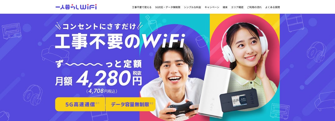 「一人暮らしWiFi」は、一人暮らしの学生や単身赴任者、シンプルな生活を求める方に向けたサービスです。特に、一人暮らしを始めたばかりの学生や引っ越しの多い単身赴任者にとって、工事不要で手軽に使い始められる点は大きな魅力。
