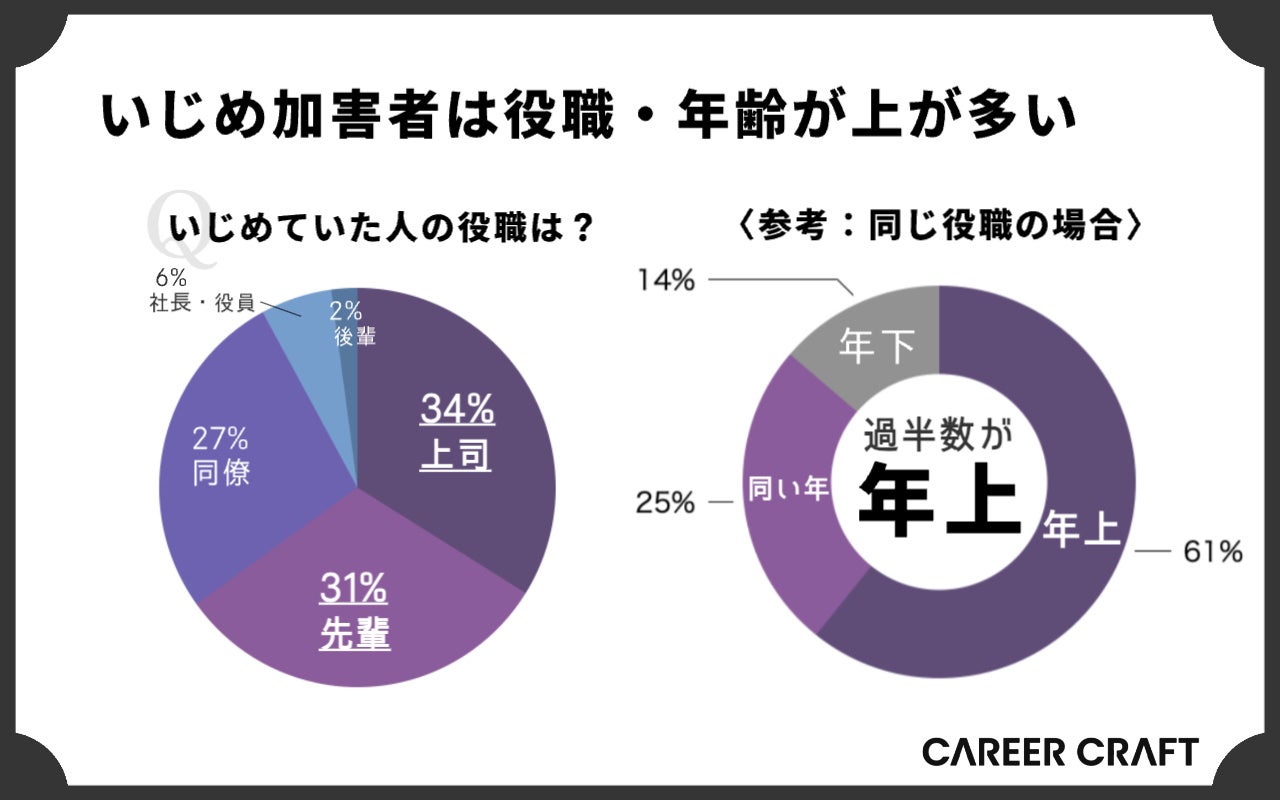 いじめの加害者の役職を聞くと、34%が上司、31%が先輩となりました。