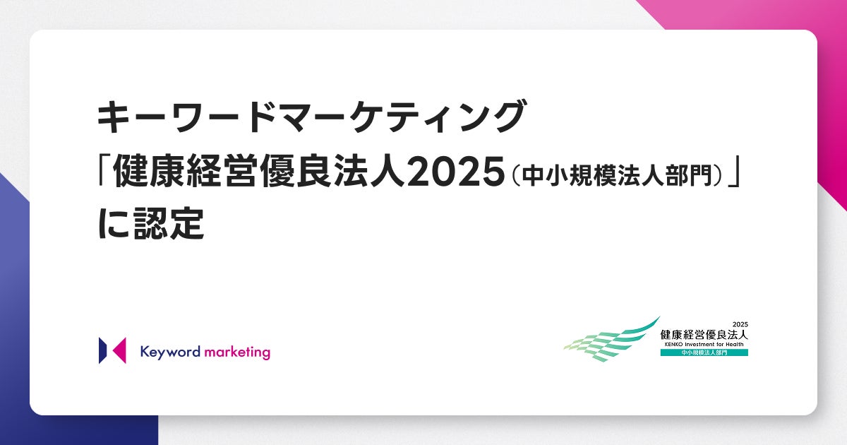 株式会社ベクトル(本社:東京都港区、代表取締役会長兼社長:西江 肇司、東証プライム:6058)の子会社である株式会社キーワードマーケティング(本社:東京都港区、代表取締役会長:滝井 秀典、以降「当社」)は、「健康経営優良法人(中小規模法人部門)」に認定されたことをお知らせいたします。