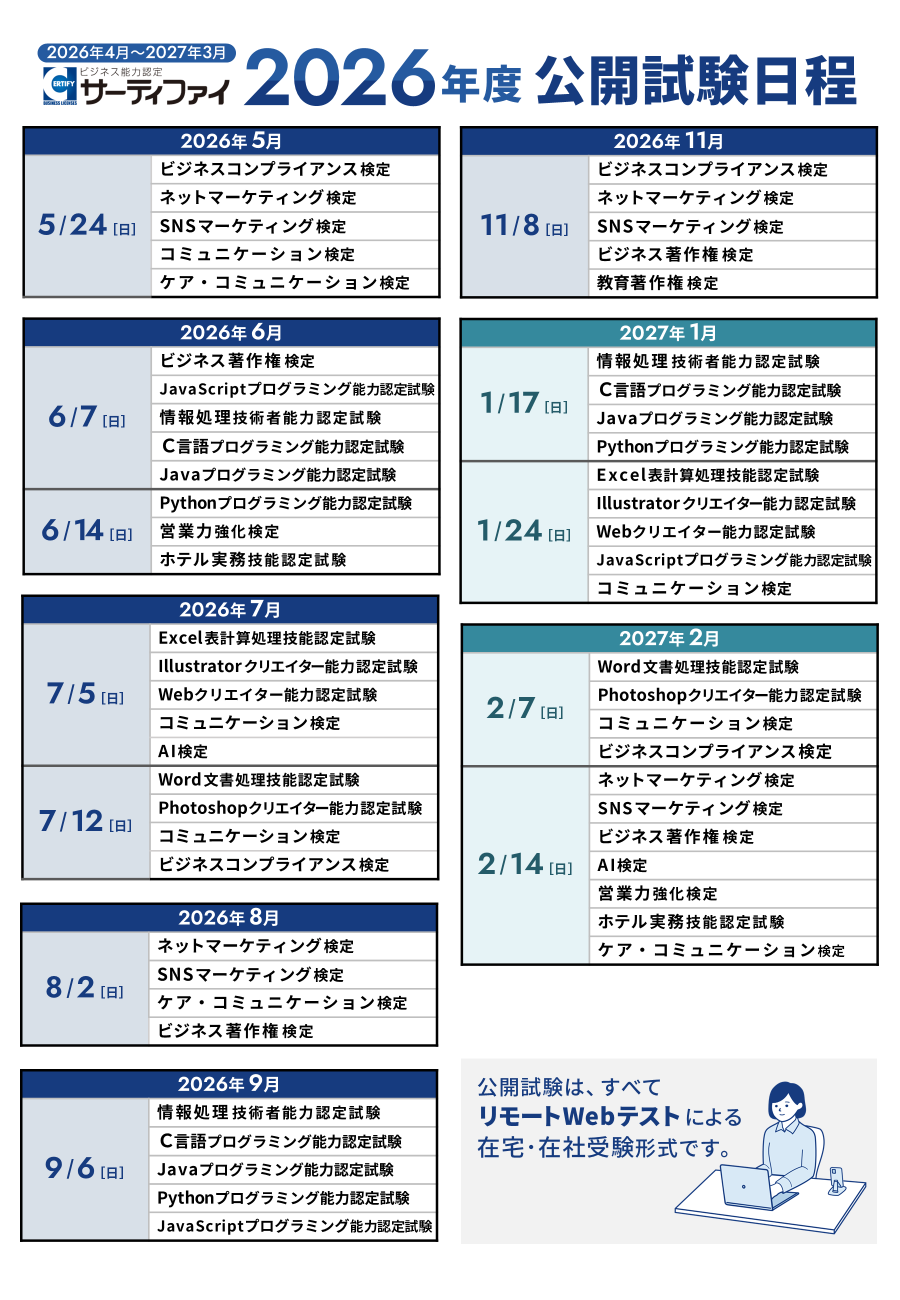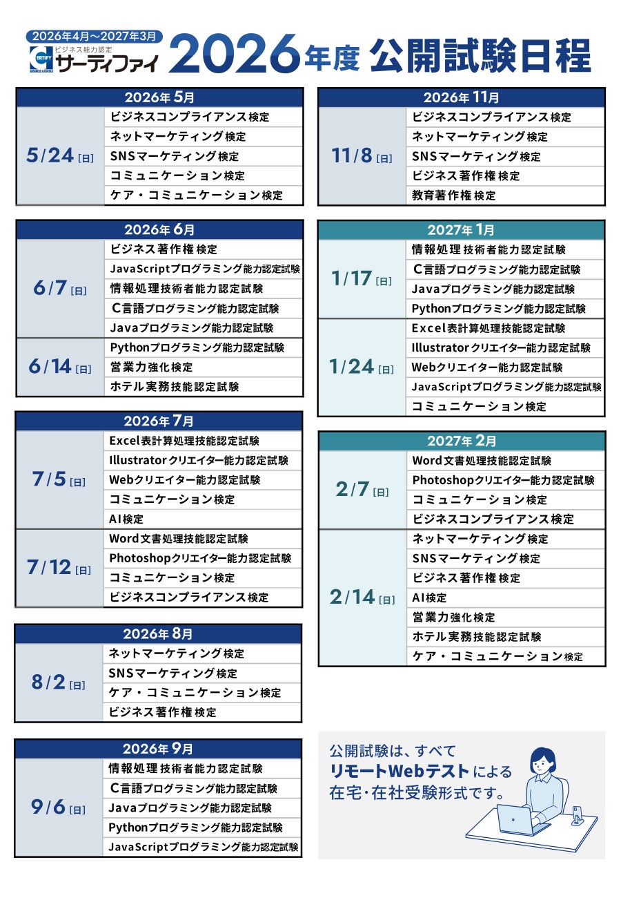 7分野30種類のビジネス資格・検定試験を主催する株式会社サーティファイ(本社:東京都中央区、代表取締役:瀧澤茂)は、2026年度の公開試験日程を発表いたしました。