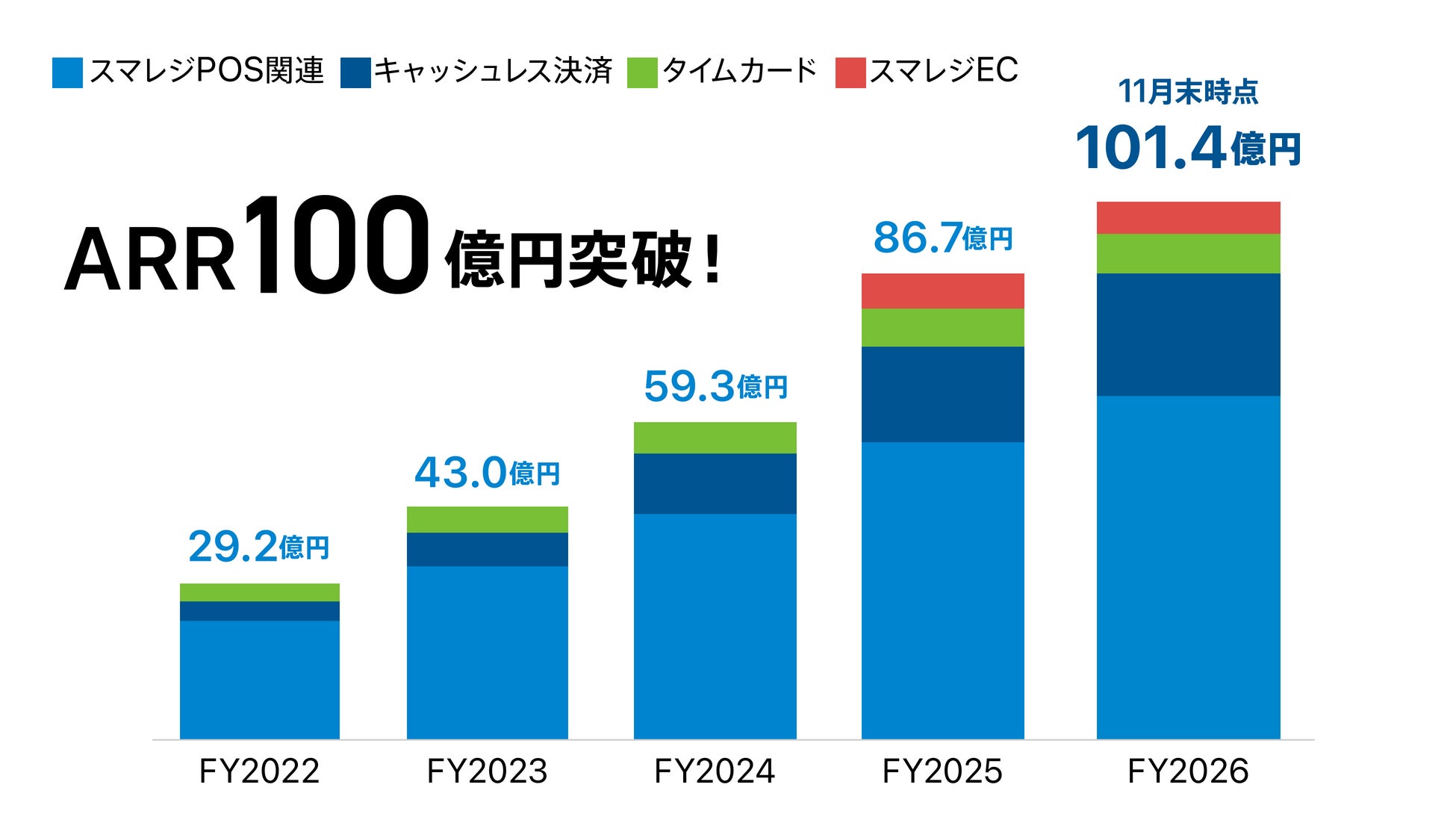 iPadなどのタブレットを利用したクラウドPOSレジ『スマレジ』を展開する株式会社スマレジ(本社:大阪市中央区、代表取締役:宮﨑 龍平、以下「当社」)は、2025年11月末時点において、当社のARR(Annual Recurring Revenue:年間経常収益)が100億円を突破したことをお知らせいたします。