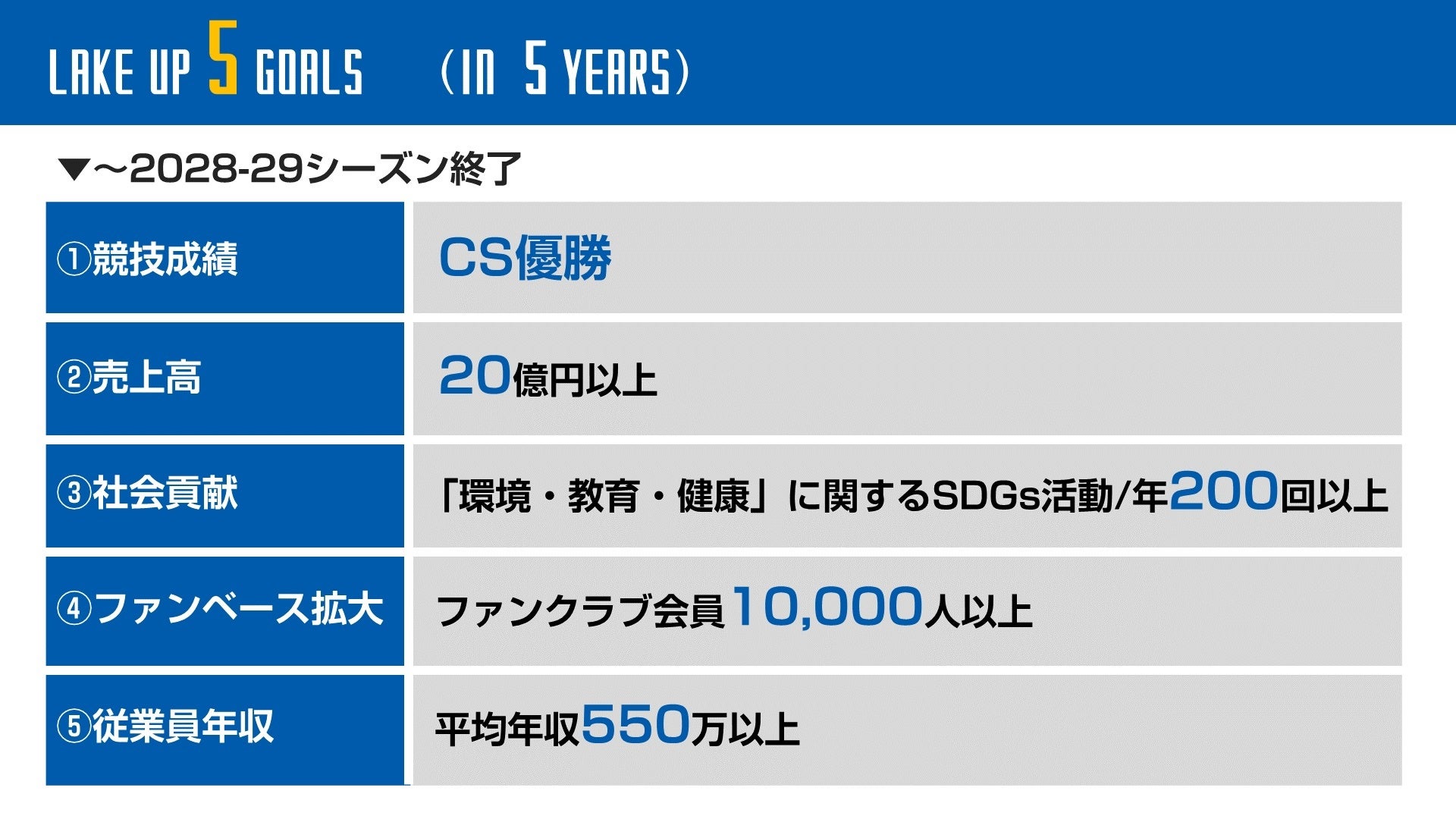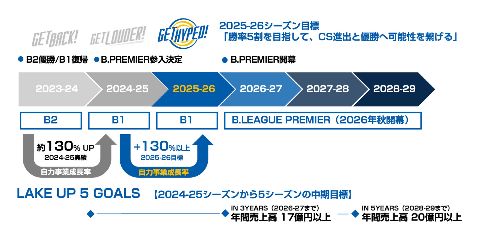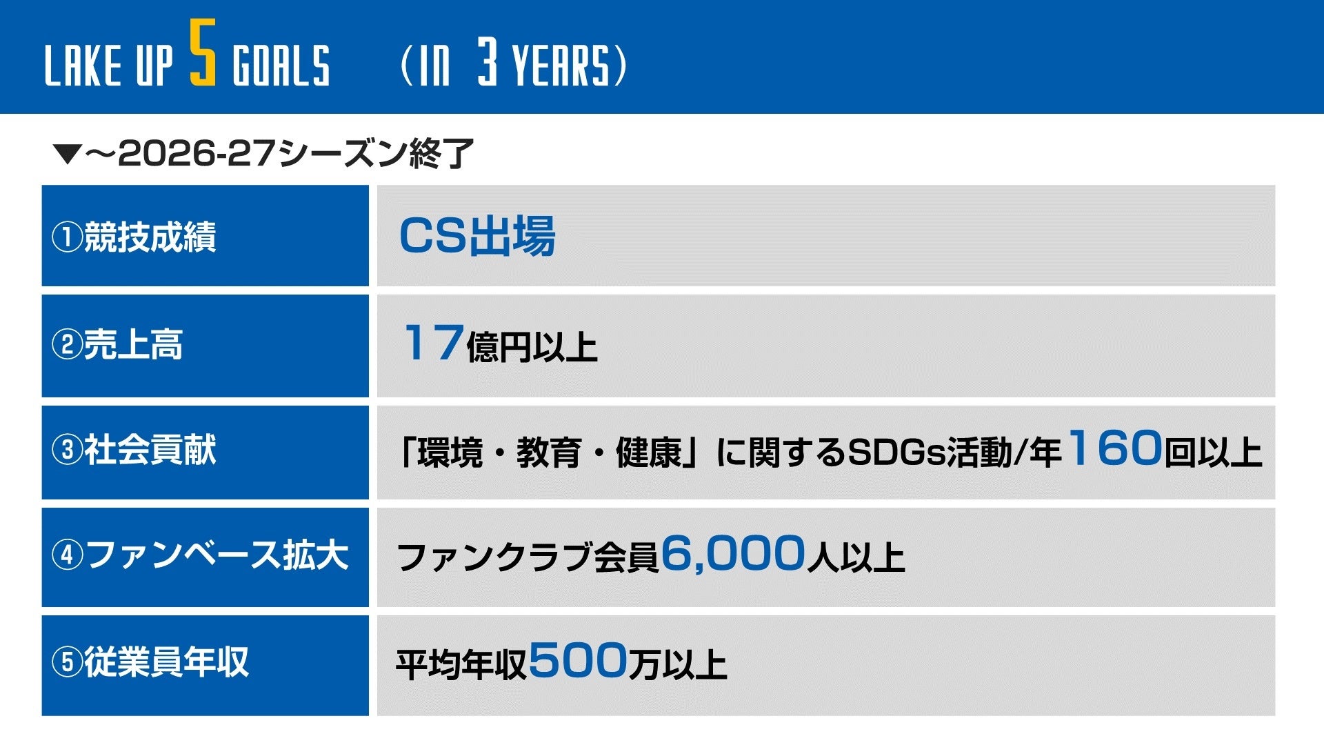 5カ年の中期目標【LAKE UP 5 GOALS】の2カ年目となる2026年6月期(第19期/2025-26シーズン)は、事業面では自力事業売上を更に130%以上成長させ、全体売上「16億円以上」を目指します。競技面ではシーズンスローガンに「Get Hyped !」を掲げ、シーズン目標として「勝率5割を目指し、CS出場と優勝へ可能性を繋ぐ」を目標に、事業面/競技面ともに”勝負の2年目”と位置付け、全員でクラブを前に進めて参ります。