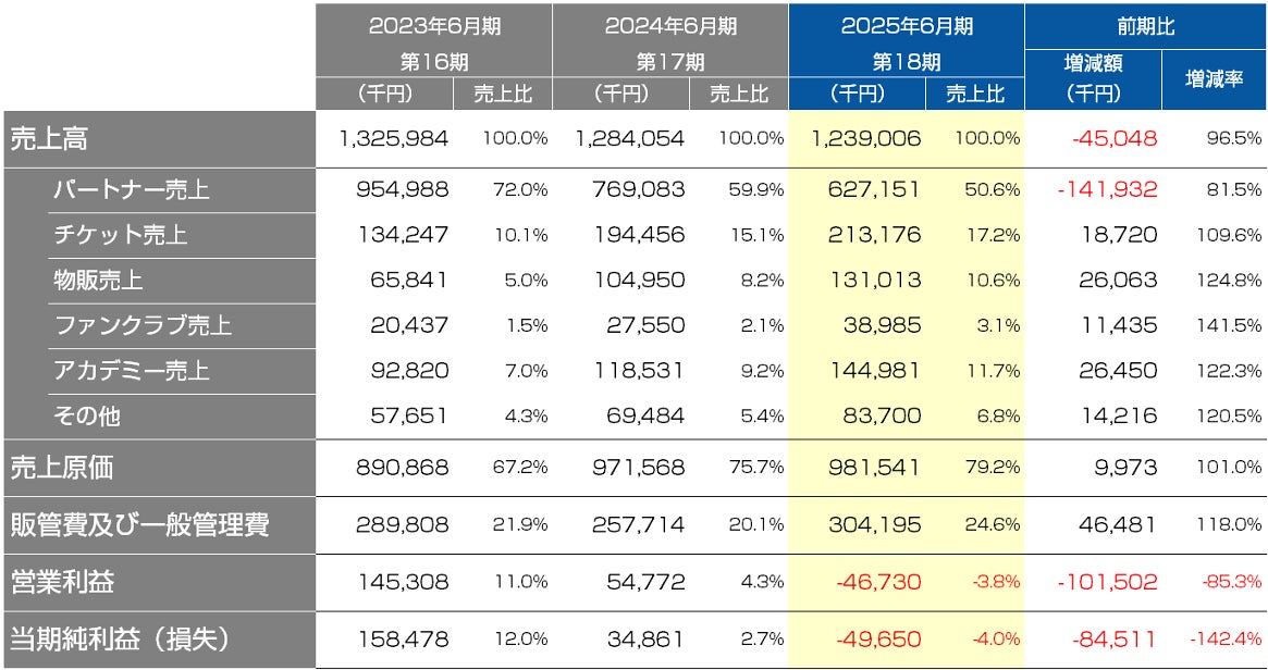 2025年6月期決算は、売上高12億3,900万円となり、最終的な損失は4,965万円でした。 全体の売上高は前期比96.5%で、前期から4,504万円の減収となりましたが、事業部単位ではチケット売上は2.13億円(前期比109.6%)、アカデミー売上は1.44億円(前期比122.3%)、物販売上は1.31億円(前期比124.8%)となり、いずれも過去最高の売上を達成しています。パートナー売上は6.27億円(前期比81.5%)となっておりますが、自力売上では前期比136.1%となっており、自力売上ベースではこちらも過去最高の売上となっております。