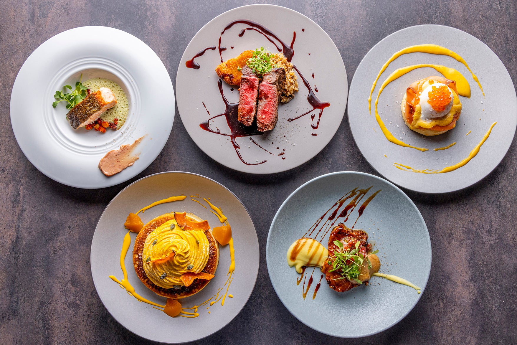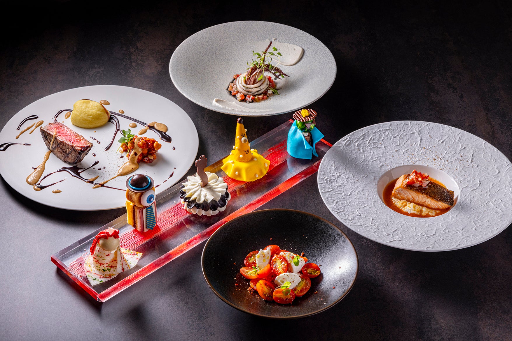 ランウェイに見立てたプレートに立ち並ぶのは秋の味覚がふんだんに感じられる妖怪スイーツたち。旬の栗やさつまいも、洋梨にぶどうなどを使用したスイーツは、個性的な見た目とは裏腹に、優しく上品な味わいに仕上げました。プレミアムプランでのみ提供されるモンブランは、カシスとの相性がベストマッチな1品で、いったんもめんがはらりと舞い下りてきたような楽しいビジュアルに。さらに、ろくろ首がステージに立つクイーンのようにスモークの演出で登場するのも見逃せないポイント。