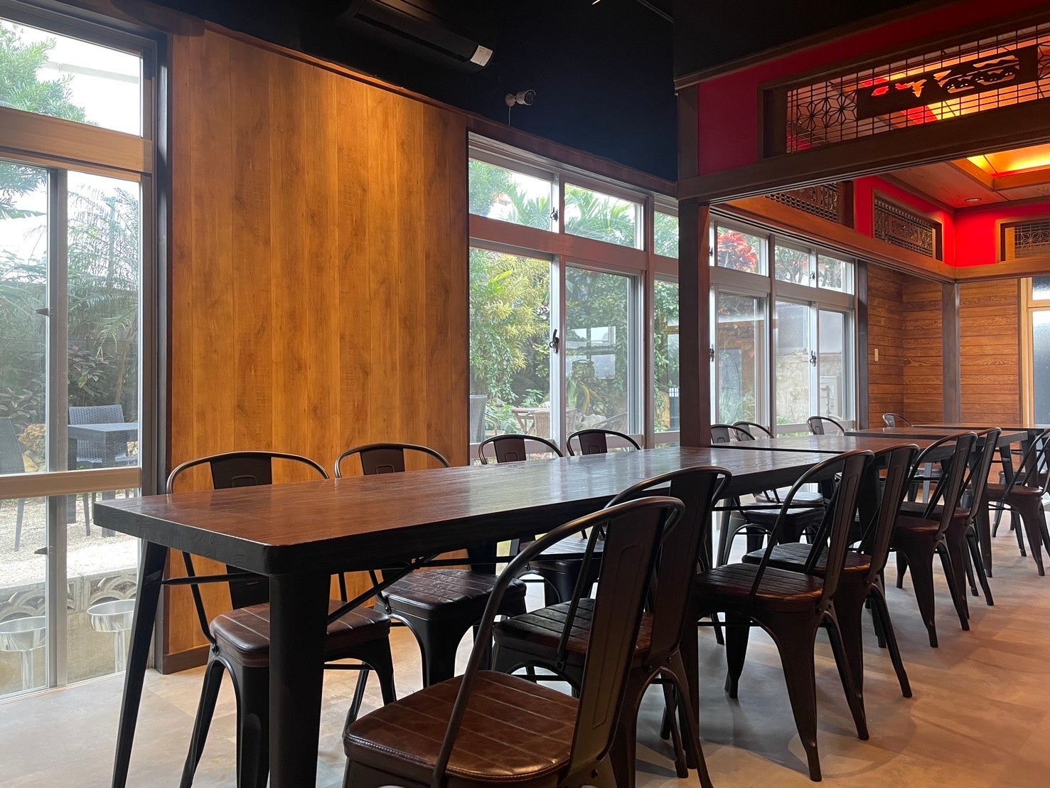 宮古島の開放的な環境になじむよう木を基調とした店内には、日本の伝統的な建築様式に見られる欄間のような装飾を施し、日本食である「ラーメン」とも通ずる日本の文化を感じられる造りとなっています。