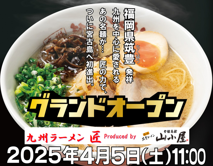 「九州筑豊ラーメン」ブランドのチェーン展開や食材の卸売りをおこなうワイエスフード株式会社(本社:福岡県田川郡香春町/代表取締役社長 小川 光久 以下、当社)は、2025年4月5日(土)に沖縄・宮古島に新規出店する『九州ラーメン 匠 produced by九州筑豊ラーメン山小屋 』を、当社運営の「山小屋」ブランドでのプロデュース店舗としてグランドオープンいたします。