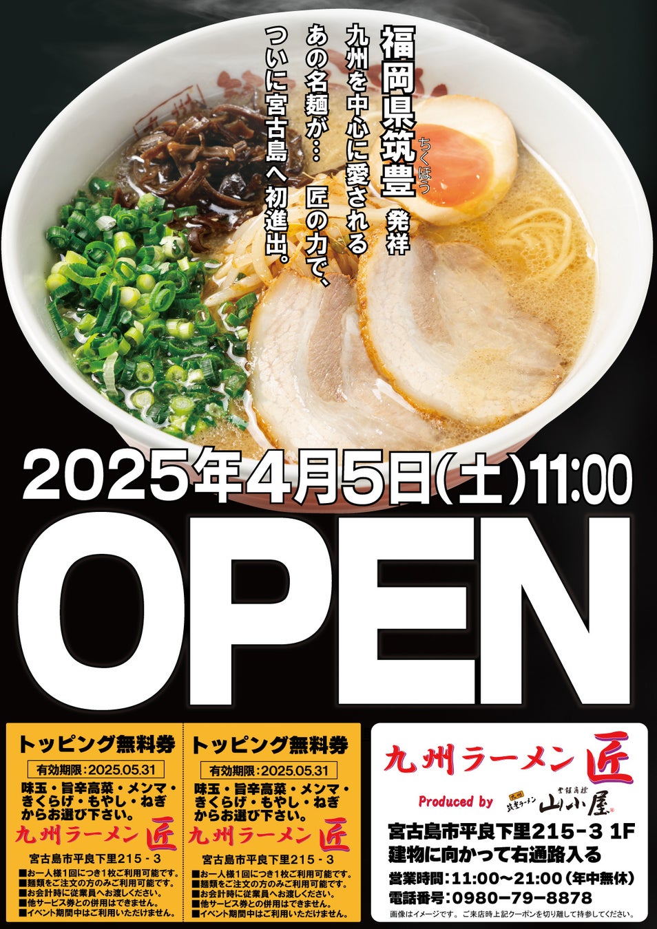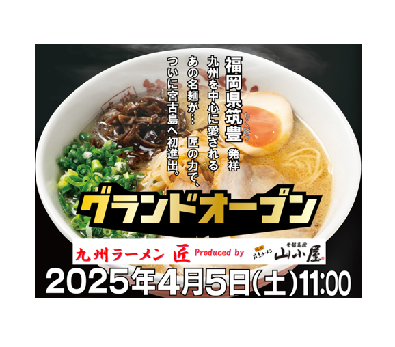 【九州筑豊ラーメン山小屋プロデュース】沖縄・宮古島に初出店!『九州ラーメン 匠 produced by 九州筑豊ラーメン山小屋』4月5日グランドオープン!沖縄への出店も視野に物流ルートを確立