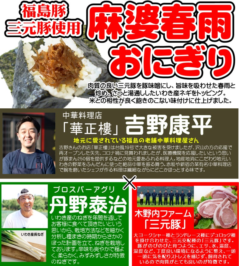 日本一受賞おにぎりコラボ企画(復刻第21弾)地元食材を使った『福島県産三元豚使用麻婆春雨おにぎり』『いわき産長ねぎと鮭のコンフィおにぎり』期間限定発売