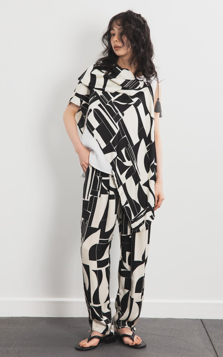 滞在先で思いっきり遊んだり、飛行機やホテルでリラックスできるパンツです。MサイズとLサイズがあり、Mサイズは150cm台~160cm台後半の方、Lは180cm台前半ぐらいの方までに着用していただけます。無地5色・柄物15色からお選びいただけ、ストールとセットアップ着用が可能です。