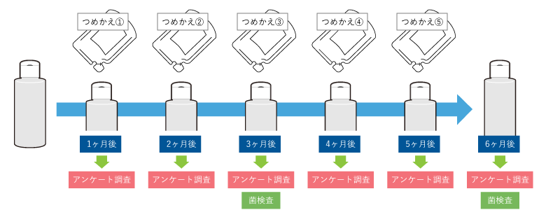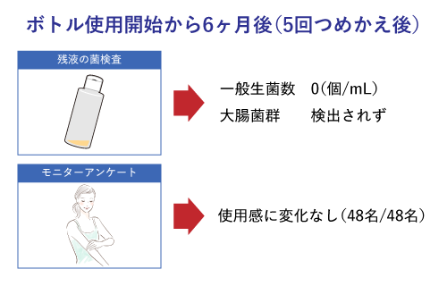 25℃と35℃で6か月間保存した未開封の化粧品からは一般生菌や大腸菌群は検出されませんでした。また、すべての化粧品には添加したブドウ球菌の増殖抑制効果が見られました。モニター開始から6か月後の試験では、リフィルボトル内の化粧品残液から一般生菌、大腸菌群、および黄色ブドウ球菌は検出されず、アンケートの結果では使用開始時と比べて化粧品の使用感の変化はほとんどないことがわかりました。