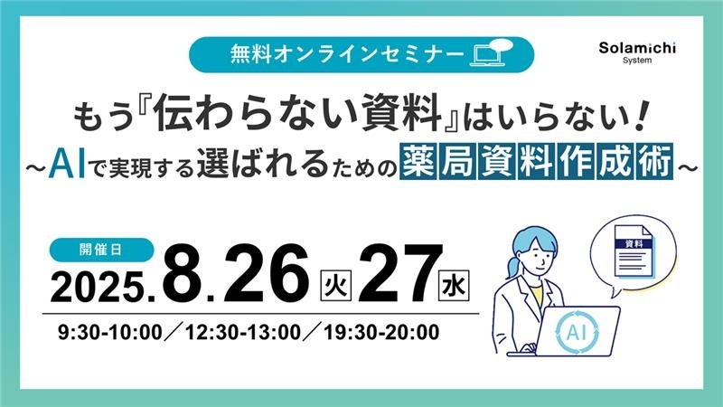 クラウド電子薬歴『CARADA 電子薬歴 Solamichi』の企画・開発・販売を行う株式会社ソラミチシステムは、無料オンラインセミナー「もう“伝わらない資料”はいらない!~AIで実現する選ばれるための薬局資料作成術~」を8月26日(火)、27日(水) に開催します。