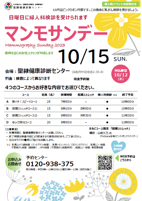 社会福祉法人 聖隷福祉事業団(法人本部:静岡県浜松市/理事長:青木善治)の健診施設、聖隷健康診断センター(所長:武藤繁貴)にて2023年10月15日(日)乳がん検診の啓発を目的とした「マンモサンデー」を開催します。