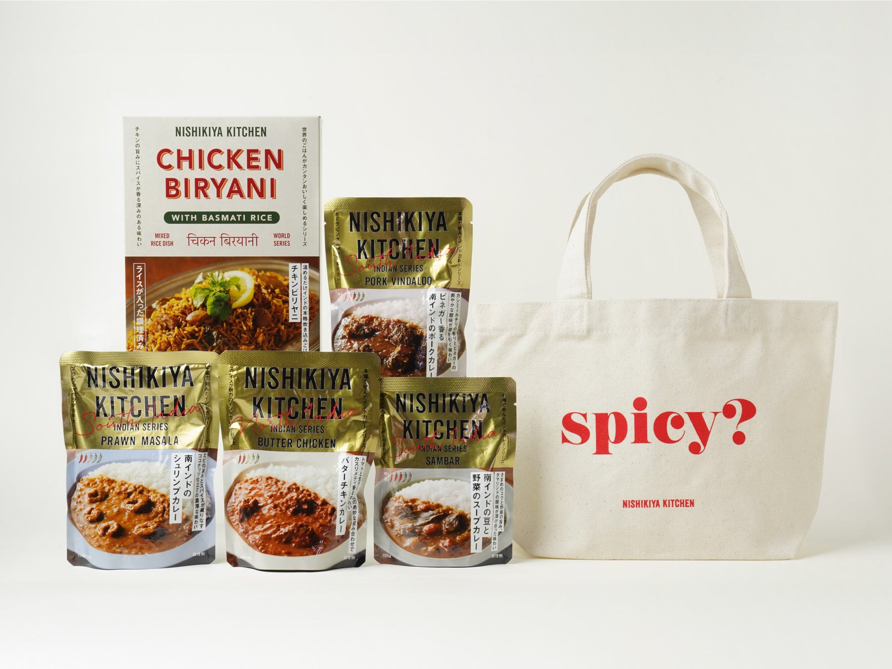 セットには、今回新発売した「ビネガー香る南インドのポークカレー」の他に、人気商品である「バターチキンカレー」や「南インドのシュリンプカレー」、同時発売の新商品「チキンビリヤニ」、一緒に合わせるのにおすすめな「南インドの豆と野菜のスープカレー」の5つの商品がはいっています。