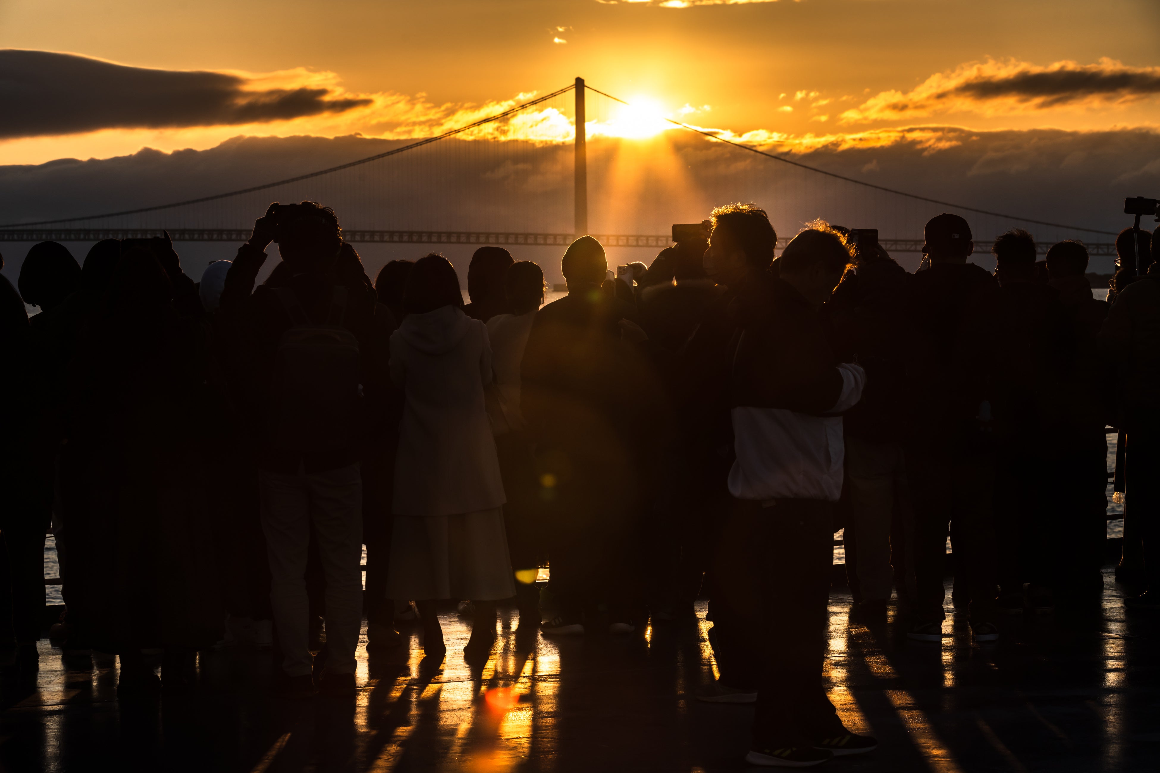 明石海峡大橋の真下をくぐる大迫力の航行シーンと、水平線から昇る初日の出の瞬間。