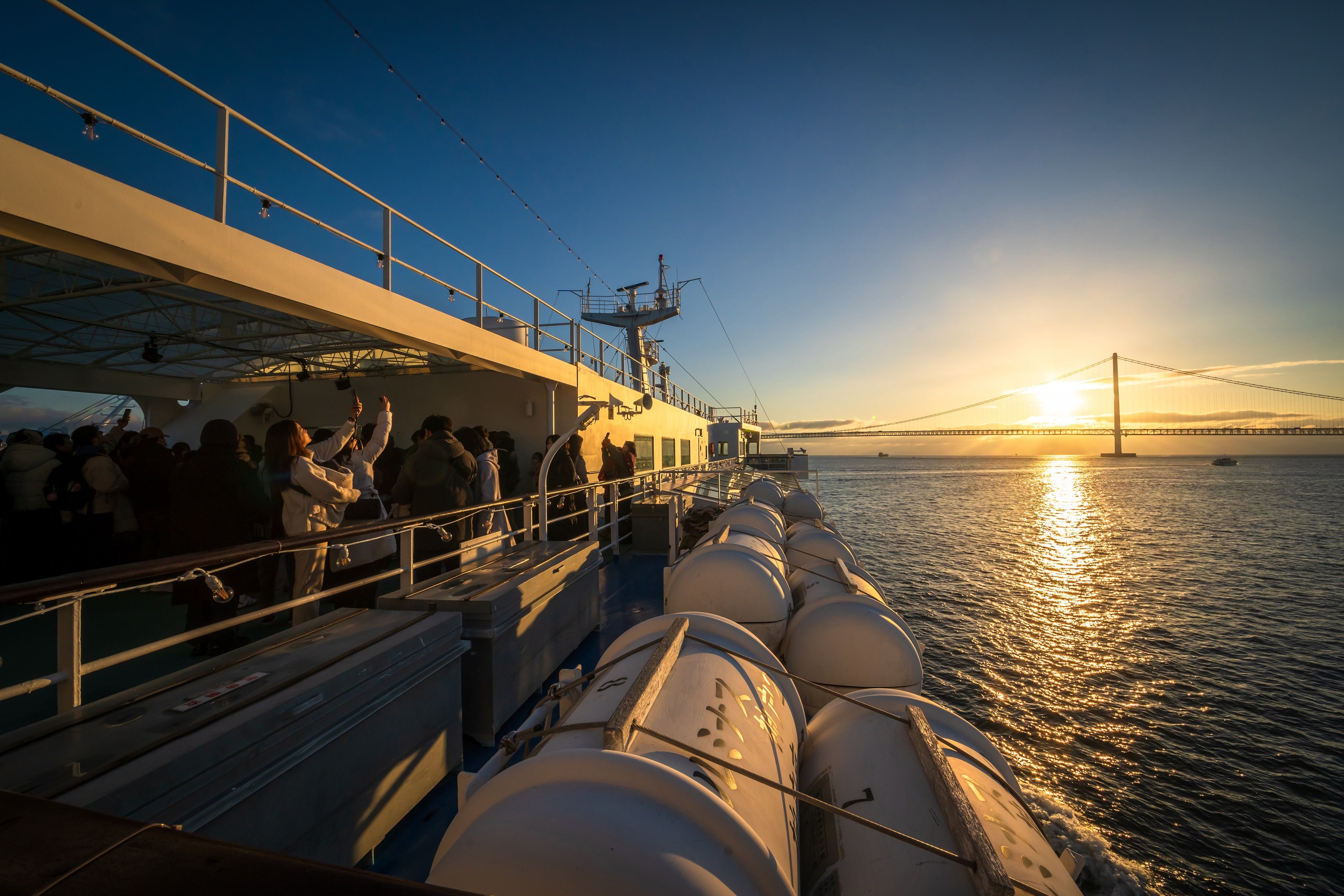 世界最大級の吊り橋「明石海峡大橋」へ向けて航行し、橋の真下をくぐるダイナミックな瞬間と、水平線から昇る初日の出の絶景を船上で体感いただけます。