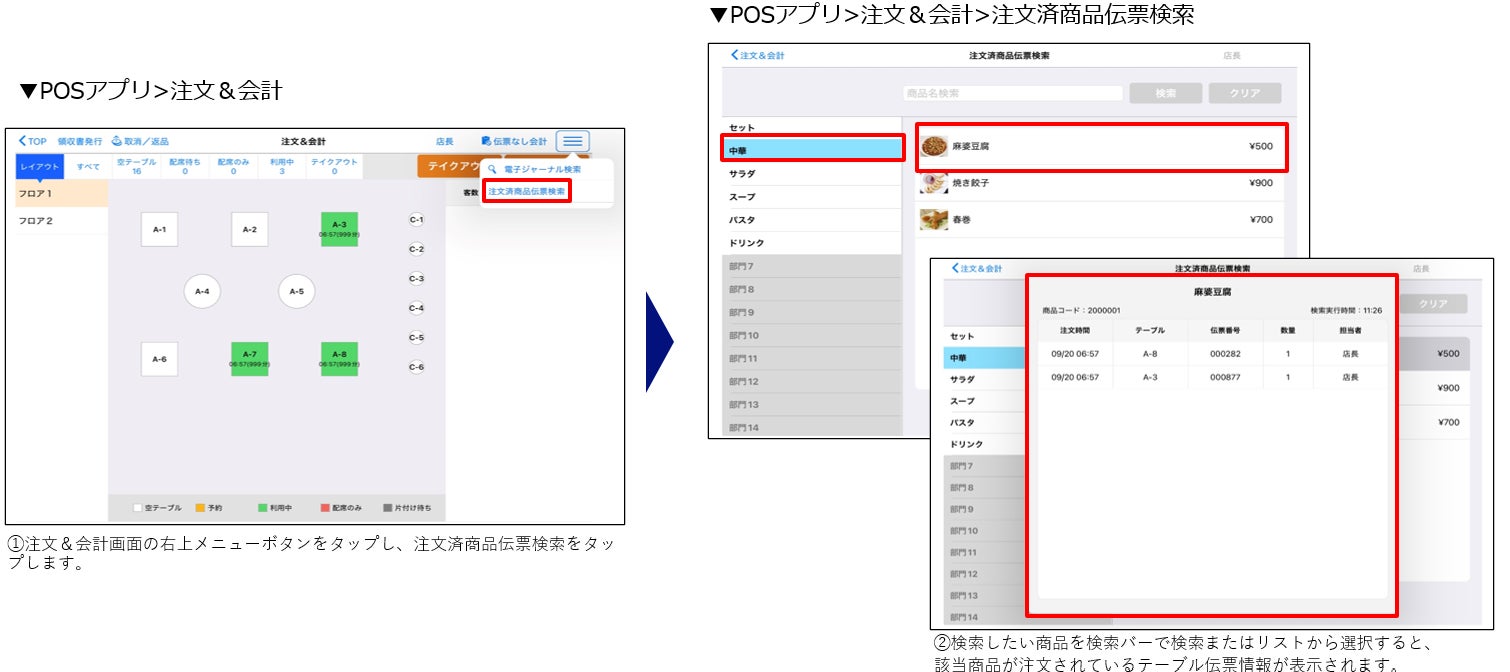 指定した商品を含む注文情報を検索することができるようになりました。なお、検索可能対象は会計前の伝票となり、会計済の伝票は検索結果に表示されません。
