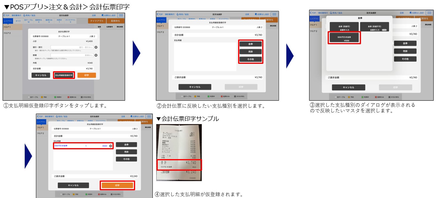 会計伝票印字の際、金券・売掛・その他の支払種別を反映して印字できるようになりました。なお、支払明細仮登録印字で登録した内容は伝票には反映されないため、会計時に改めて支払明細をご登録ください。