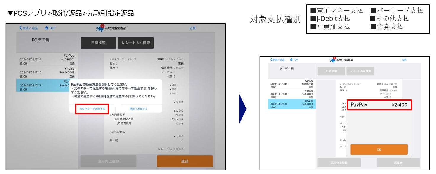 電子マネーやバーコード決済での会計において、元の決済種別で元取引指定返品ができるようになりました。なお、対象支払種別は、電子マネー支払、バーコード支払、J-Debit支払、社員証支払、金券支払となります。