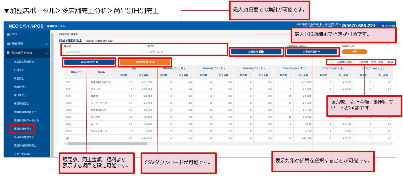 新機能5:多店舗分析機能強化(商品別日別売上分析、商品別店舗別売上分析、商品別時間帯別売上分析)