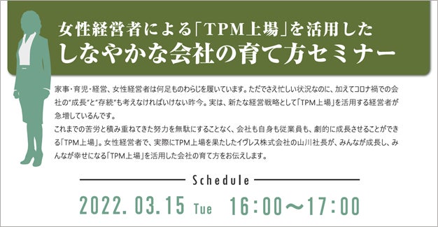 株式会社日本M&Aセンター(以下、日本M&Aセンター、本社:東京都千代田区 / 代表:三宅 卓 / URL:https://www.nihon-ma.co.jp/)は、東証「TOKYO PRO Market(TPM)」に上場した経営者が登壇するオンラインセミナー「女性経営者によるTPM上場を活用したしなやかな会社の育て方セミナー」を、3月15日に開催いたします。
