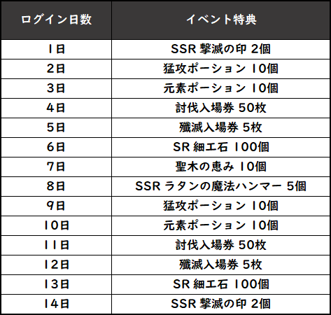 期間中に「グランサガ」にログインすると、「SSR撃滅の印」や、10回召喚が行える「聖木の恵み」など、豪華な内容となっております。欠かさずログインしましょう!