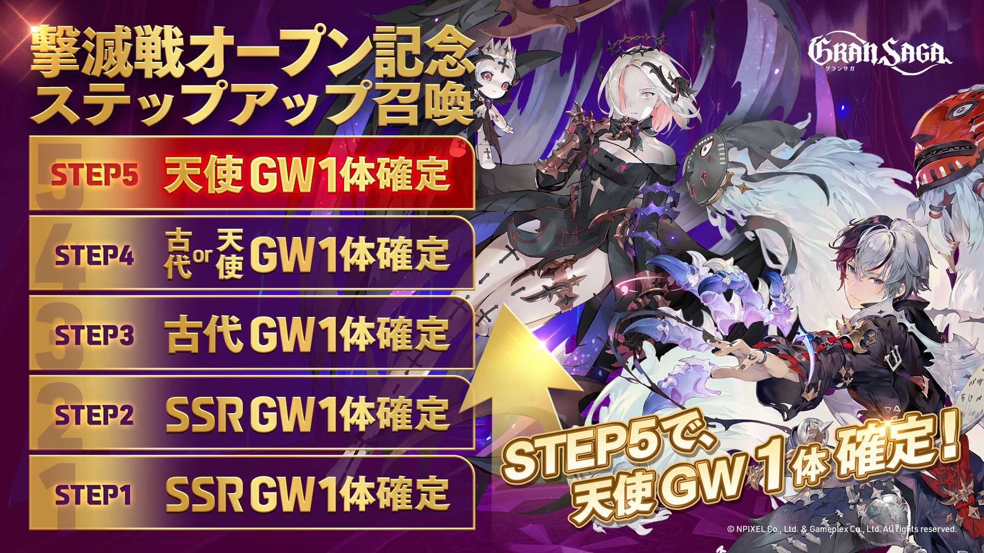 STEP1、STEP2はSSR GWが1体確定、STEP3は古代SSR GWが1体確定、STEP4は古代/天使SSR GWから1体確定、STEP5は天使SSR GWから1体確定で手に入れることができ、非常に豪華な内容となっております!