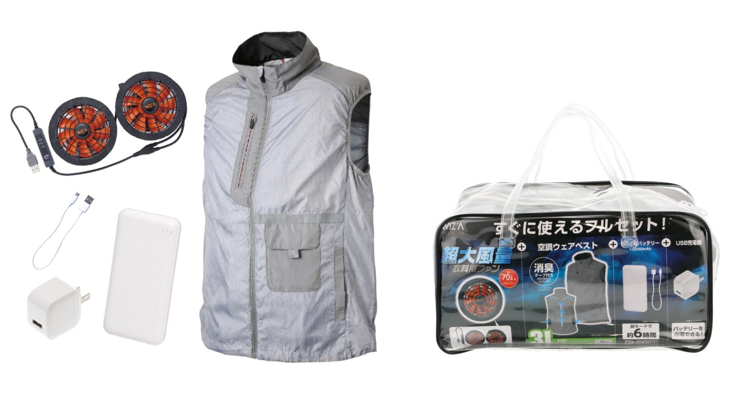 超大風量衣料用ファンとベスト、モバイルバッテリー、USBアダプター付きですぐに使えるフルセット